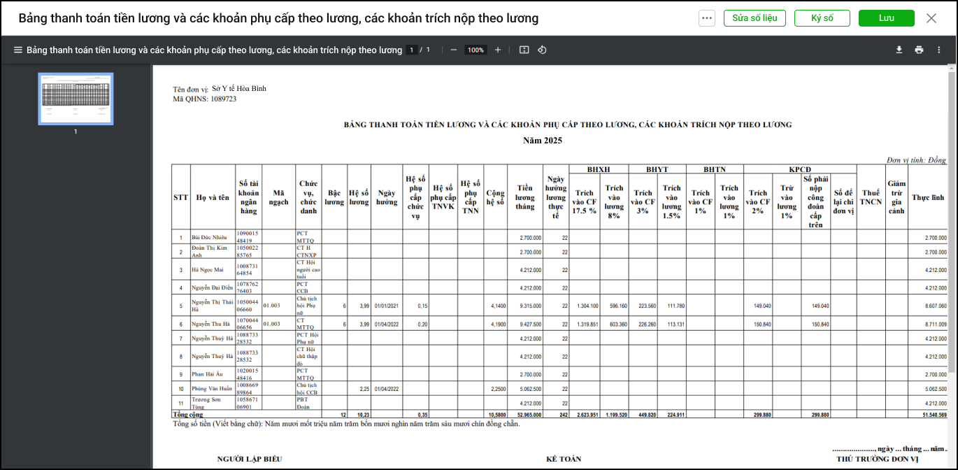 3. Phần mềm hiển thị bảng thanh toán tiền lương và các khoản phụ cấp theo lương, các khoản trích nộp theo lương được tổng hợp từ nhiều bảng tính lương mà anh/chị vừa thiết lập.