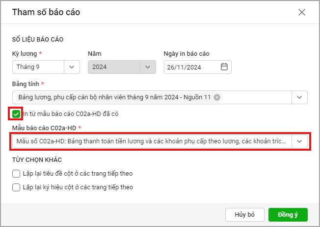 Lưu ý: Nếu anh/chị muốn in bảng lương, phụ cấp khác theo mẫu đã in của tháng trước để giảm thời gian sửa chữa, anh/chị tích In từ mẫu báo cáo đã có, và chọn mẫu báo cáo đã lập trước đó, chương trình sẽ lấy lên các thiết lập từ mẫu bảng lương đã có bao gồm: Thiết lập dữ liệu, gom nhóm dữ liệu và thiết lập hiển thị dữ liệu