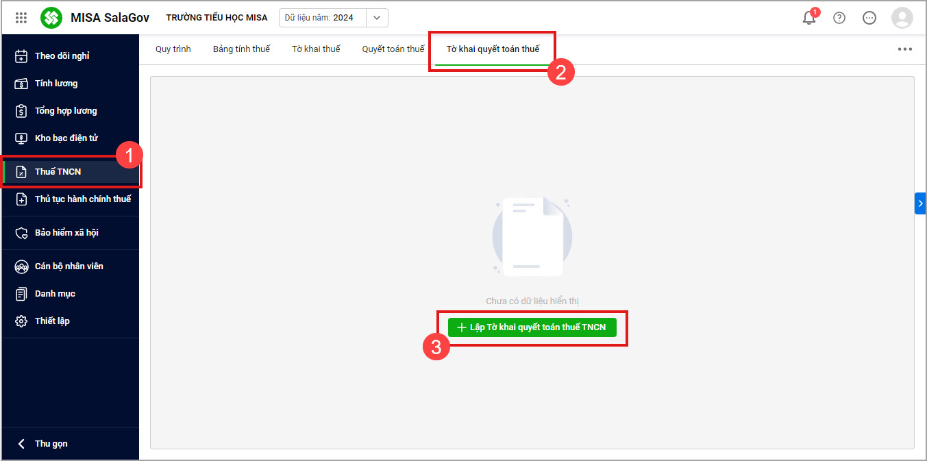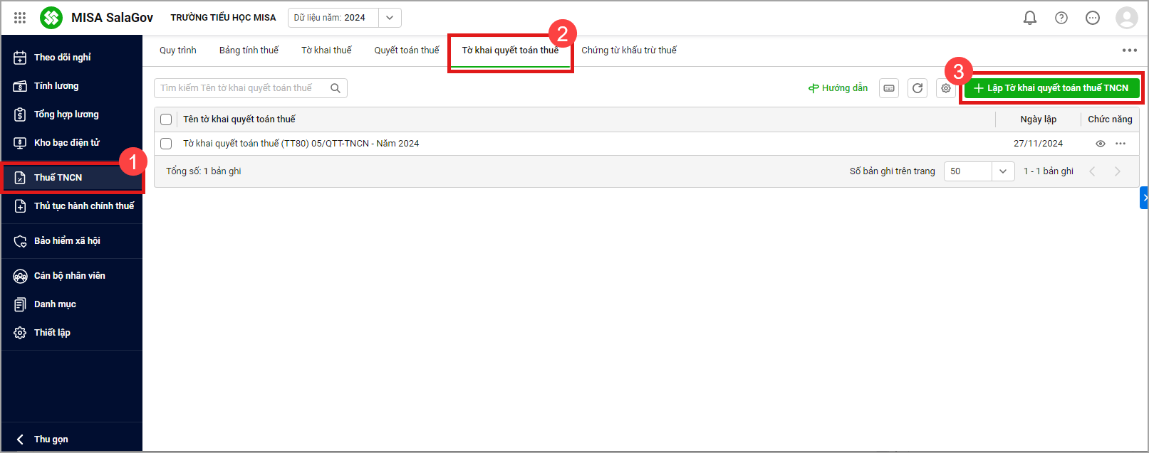 1. Anh/chị vào menu Thuế TNCN\Tờ khai quyết toán thuế\Lập Tờ khai quyết toán thuế TNCN
