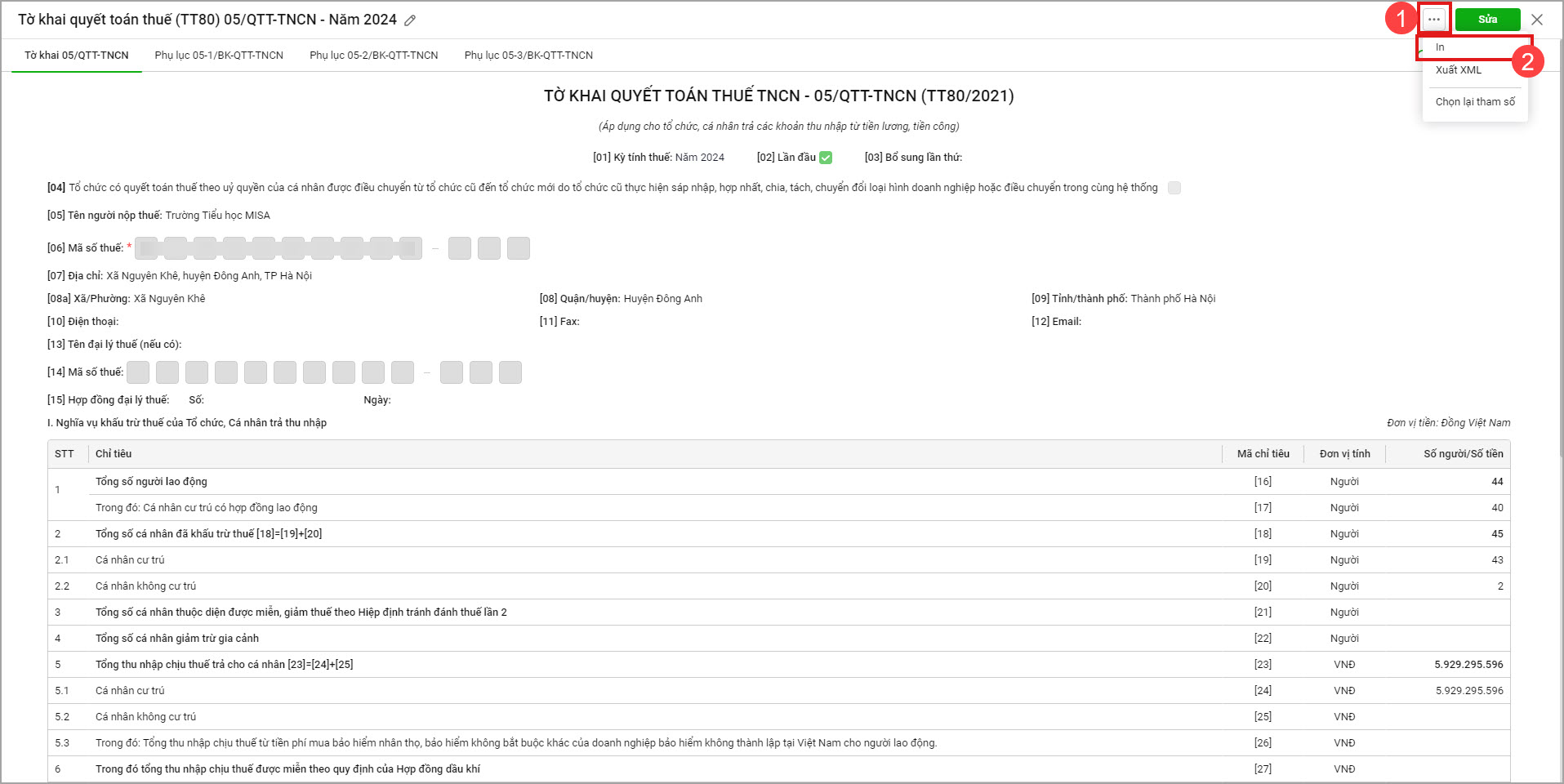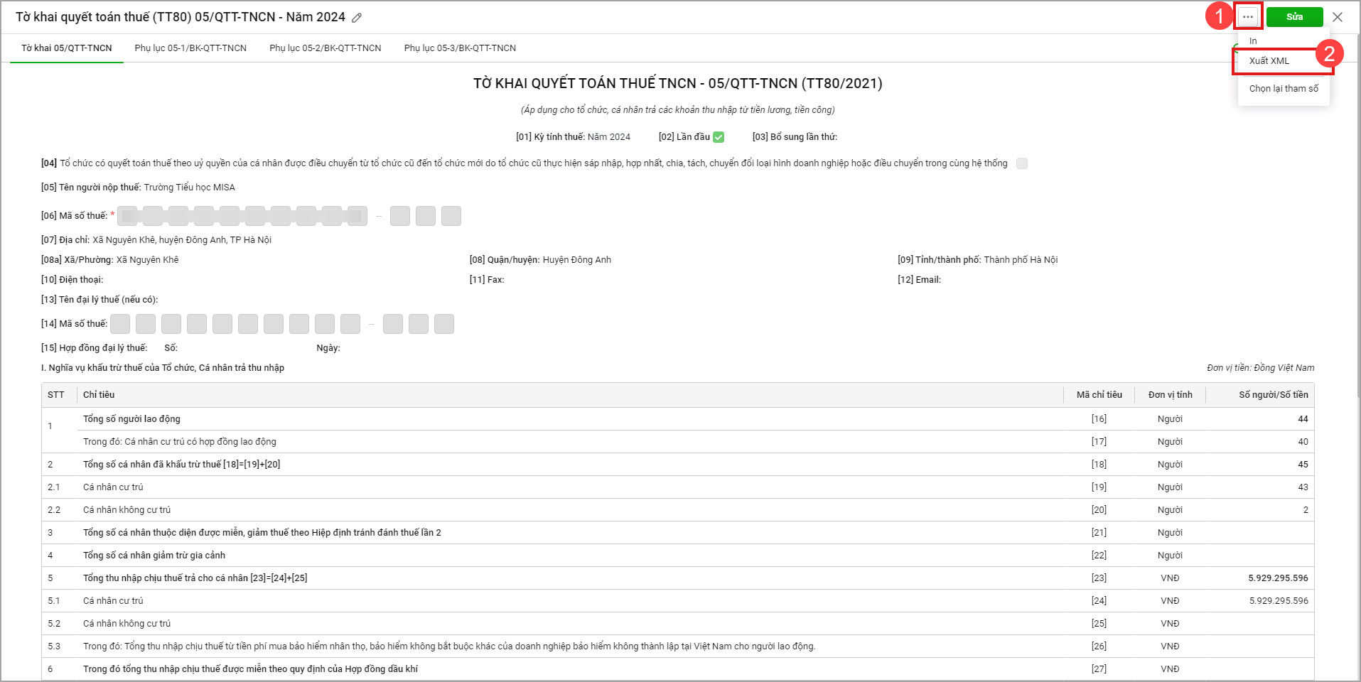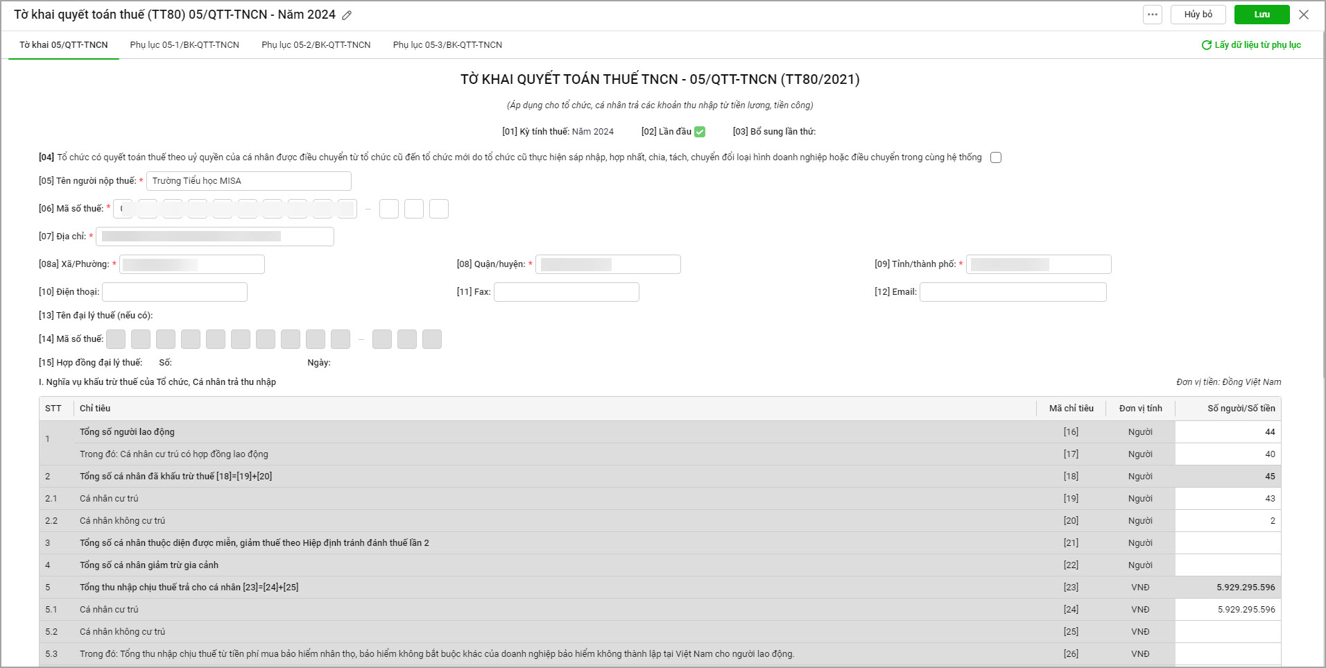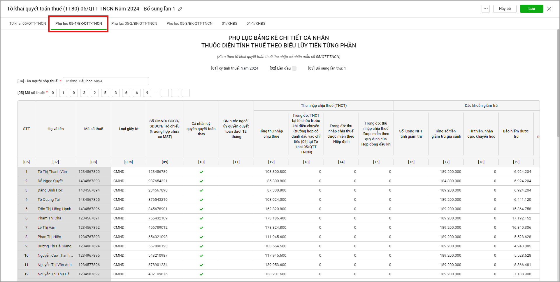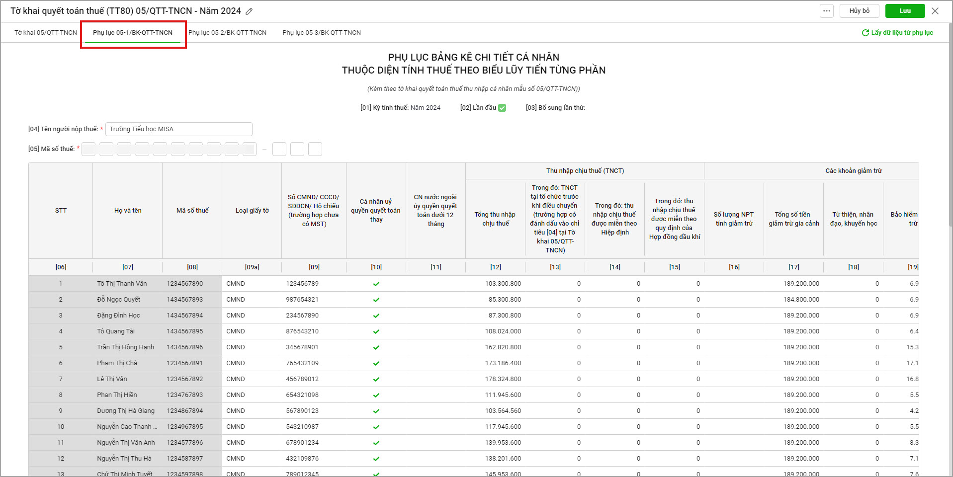 - Phụ lục 05 – 1/BK-QTT-TNCN lấy lên thông tin những CBNV có thuế suất lũy tiến bao gồm các trường thông tin như: Tổng thu nhập chịu thuế, các khoản giảm trừ, số thuế đã nộp trong năm