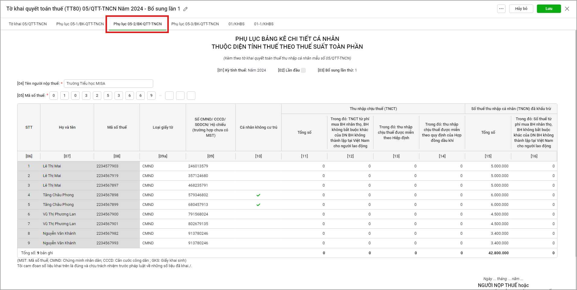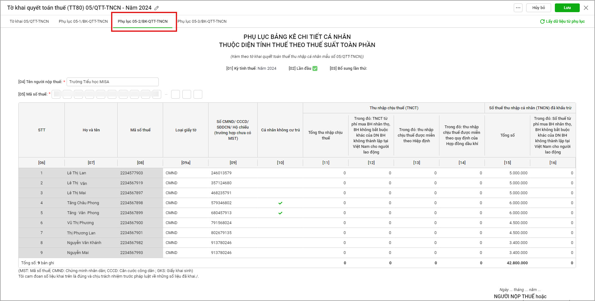 - Phụ lục 05 – 2/BK-QTT-TNCN lấy lên thông tin những CBNV có thuế suất toàn phần bao gồm các thông tin tương tự như phụ lục 05 -1/BK-QTT-TNCN, nếu có bổ sung/sửa số liệu anh/chị sửa trực tiếp vào bảng tính