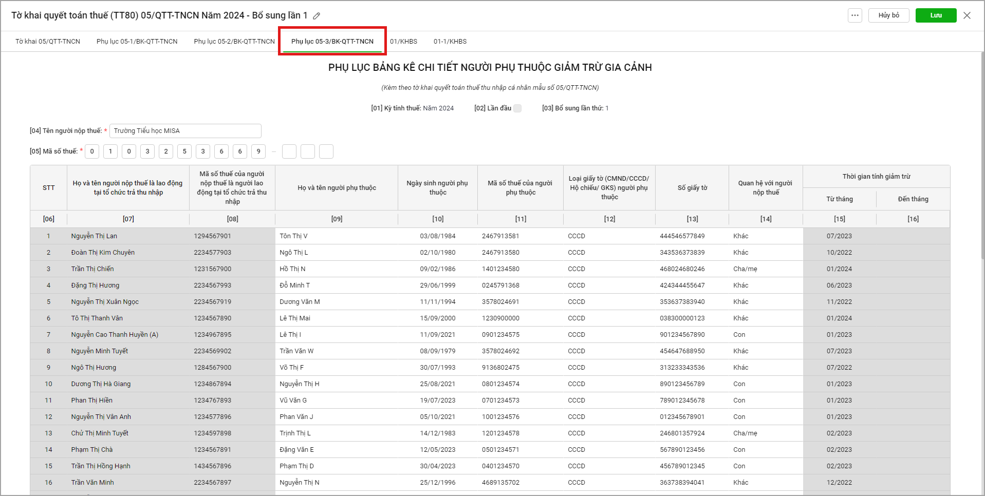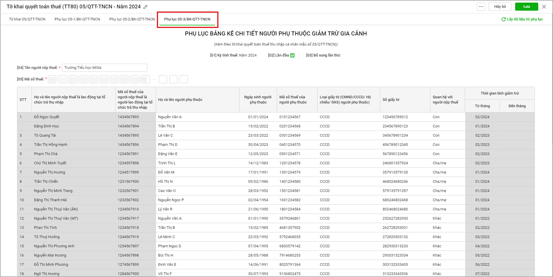 - Phụ lục 05 – 3/BK-QTT-TNCN lấy lên thông tin người phụ thuộc của CBNV có ủy quyền quyết toán thuế được lấy từ phụ lục 05 – 1/BK-QTT-TNCN