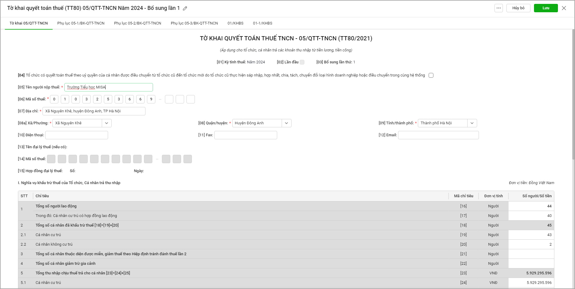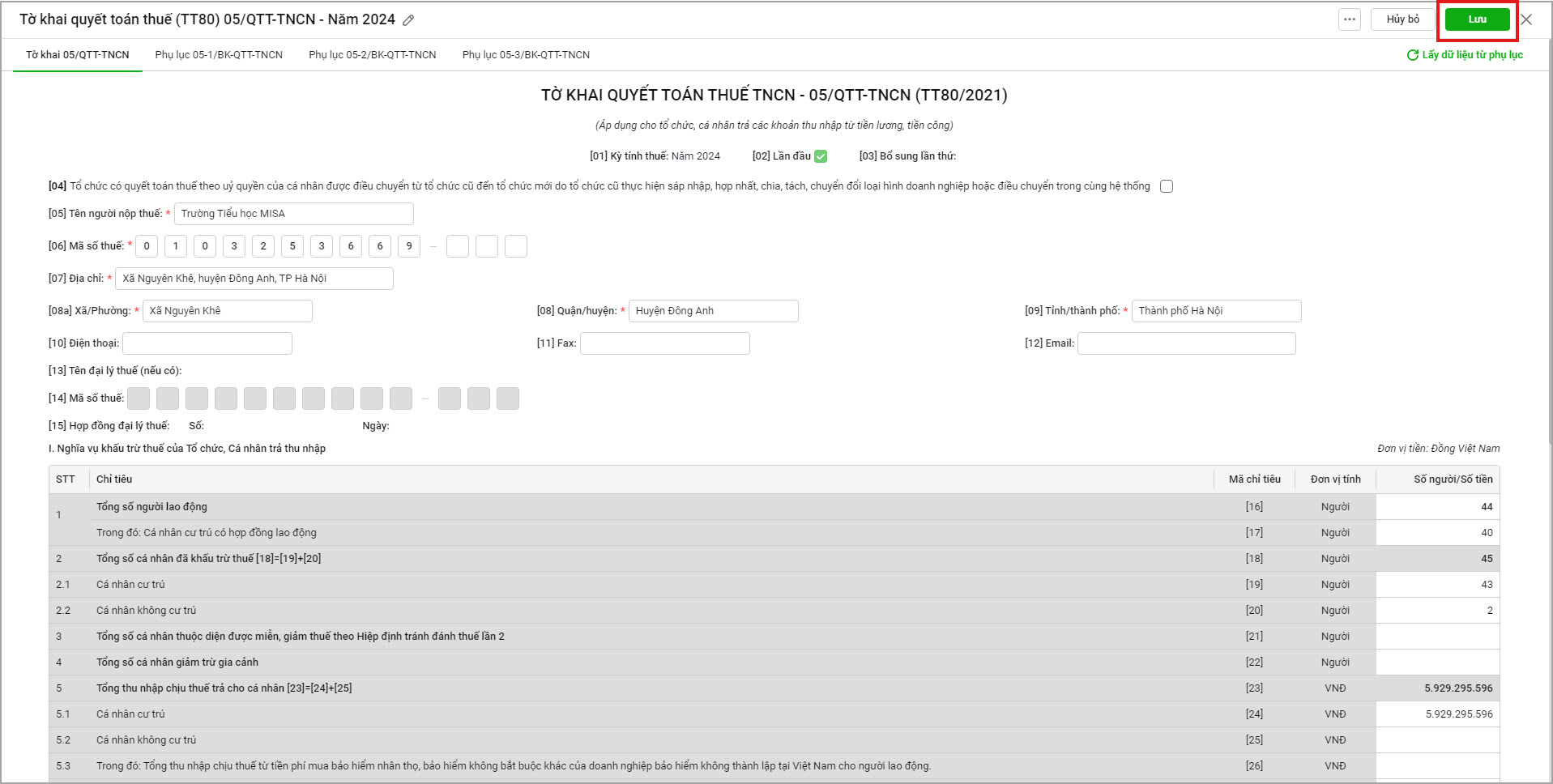 3. Thông tin quyết toán thuế sẽ được cập nhật lên tờ khai quyết toán thuế và các phụ lục đi kèm: