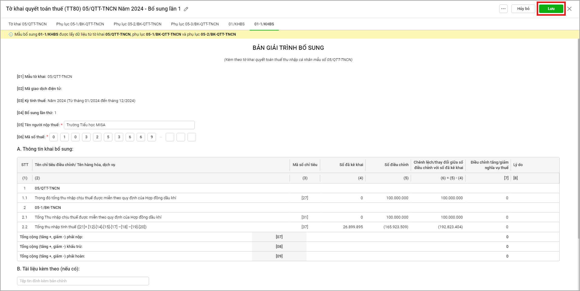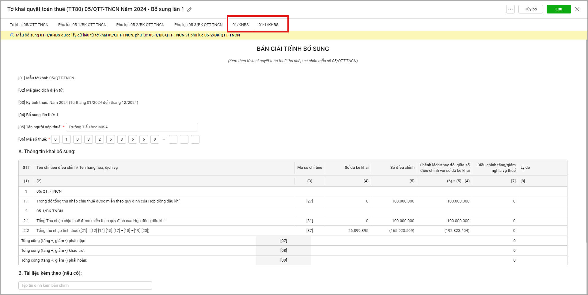 - Phần mềm tự động tổng hợp các chỉ tiêu được điều chỉnh trên các phụ lục đi kèo, và Tờ trình mẫu số 01 – 1/KHBS, tờ khai Mẫu số 01/KHBS