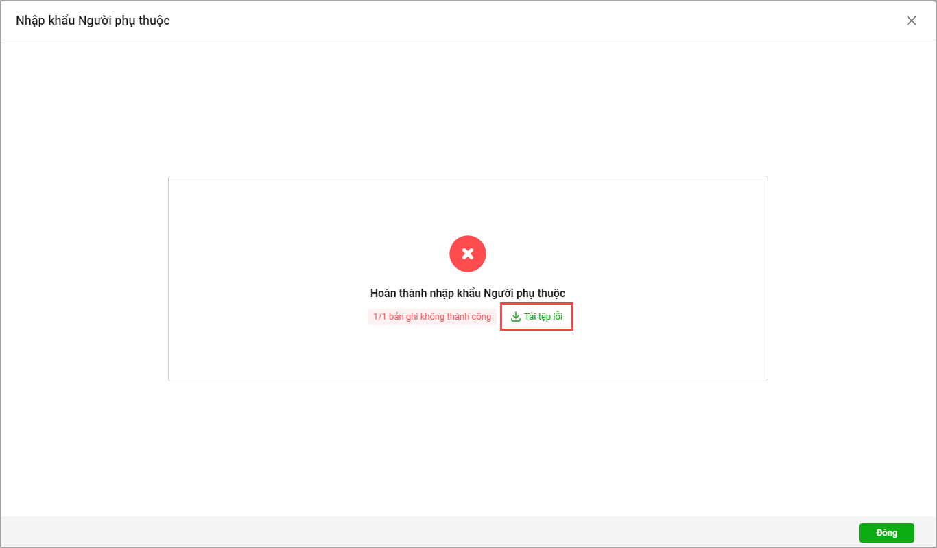• Nếu có thông tin không hợp lệ, phần mềm sẽ hiển thị kết quả nhập khẩu là lỗi, chọn Tải tệp lỗi để kiểm tra nguyên nhân