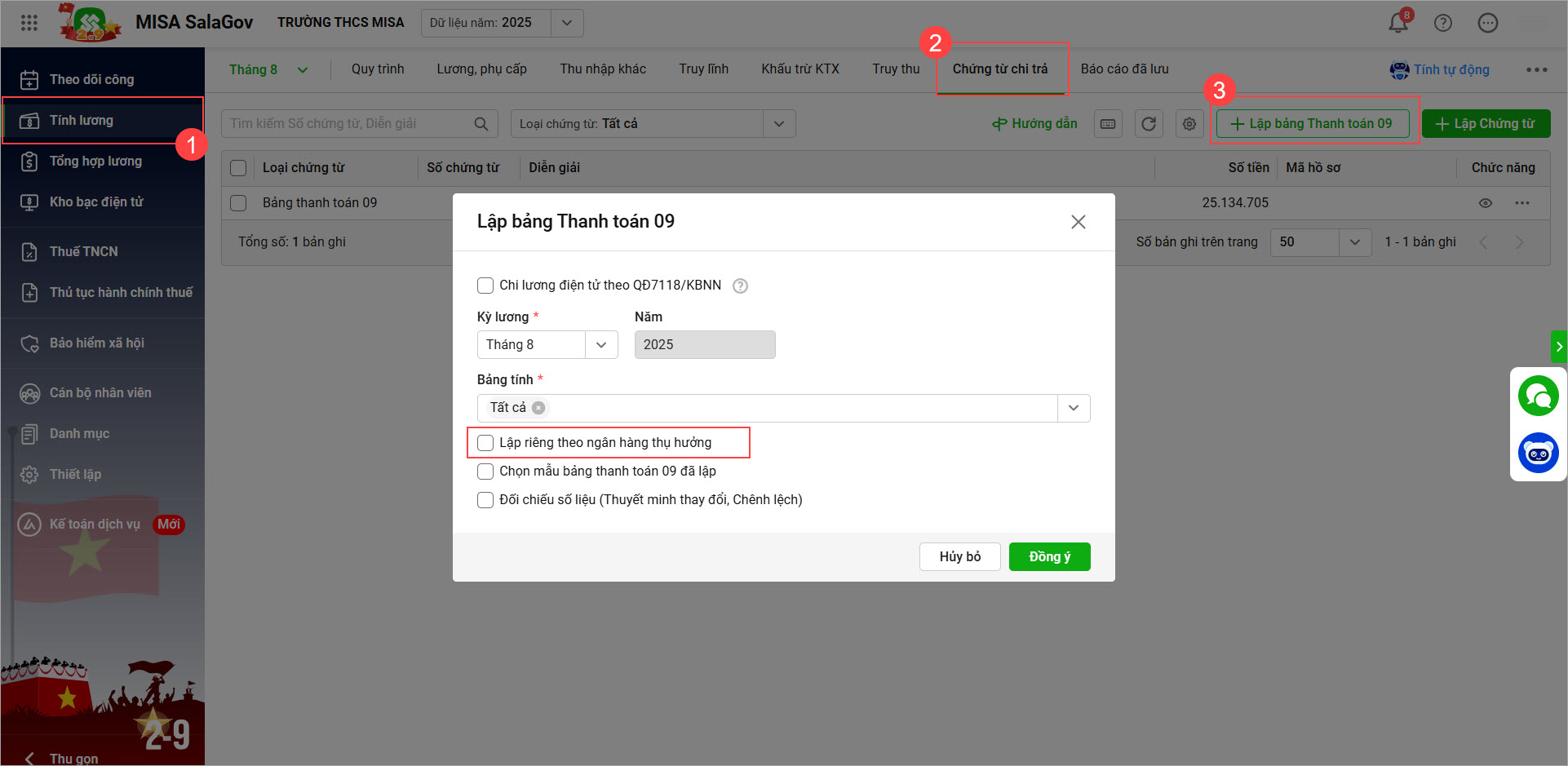 Khi lập bảng 09 theo mẫu chi lương điện tử và không chi lương điện tử trên tham số: Phần mềm bổ sung lựa chọn Lập riêng theo ngân hàng thụ hưởng
