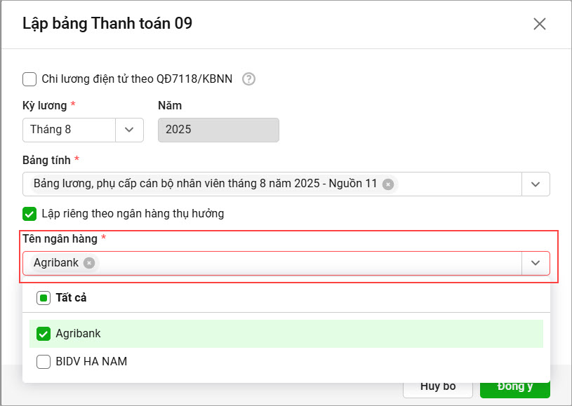 • Khi tích chọn lập bảng riêng theo ngân hàng, phần mềm sẽ hiển thị danh sách các ngân hàng mà CBNV đã khai báo.