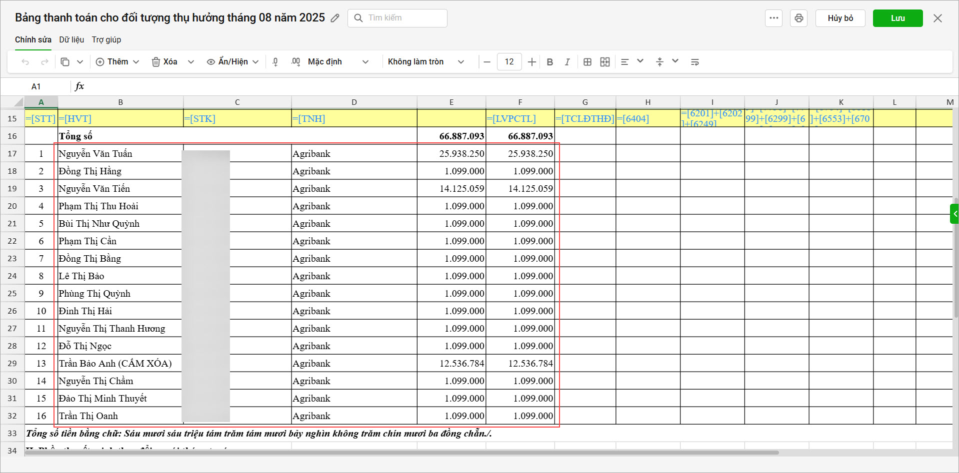 Hàng tháng, khi tính lương cho CBNV, kế toán sẽ tách bảng tính lương, phụ cấp theo khối Quản trị và khối Văn phòng. Trong khối Văn phòng có các CBNV dùng VCB và Agribank. Tương tự với khối Quản trị. Lập bảng thanh toán 09: từ 2 bảng lương, phụ cấp của 2 khối Văn phòng và Quản trị và tách thành 2 bảng thanh toán 09 theo 2 ngân hàng riêng biệt.