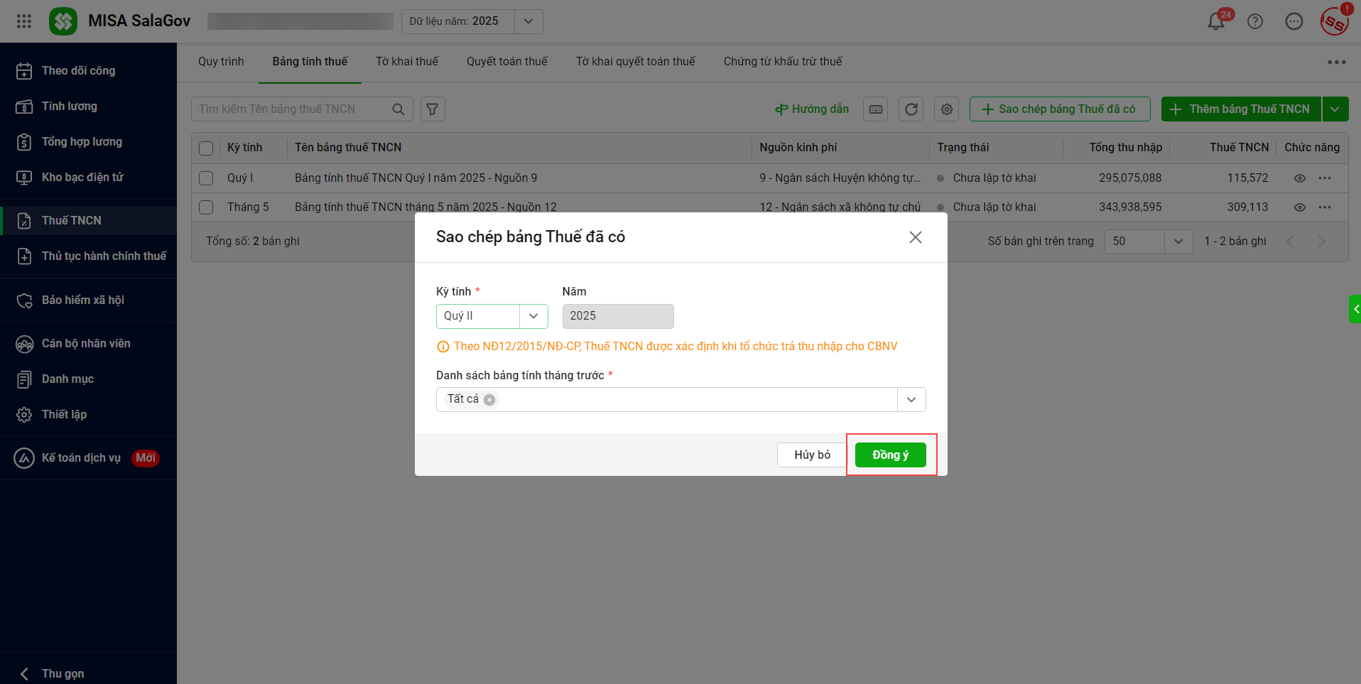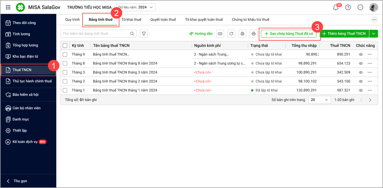Vào menu Thuế TNCN\Bảng tính thuế\Sao chép bảng Thuế đã có