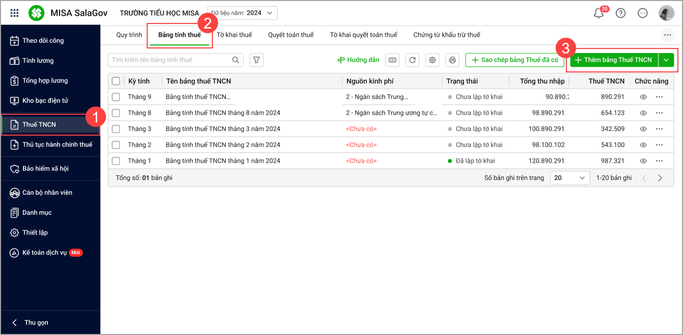Vào menu Thuế TNCN\Bảng tính thuế\Thêm bảng Thuế TNCN