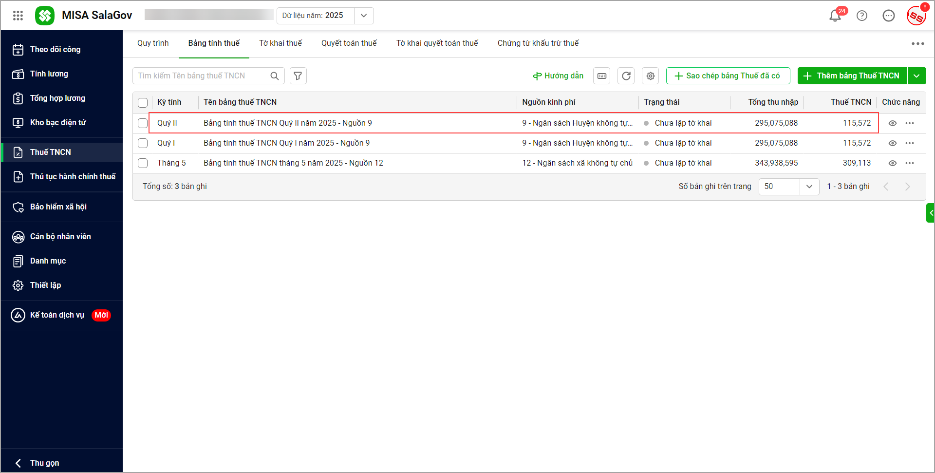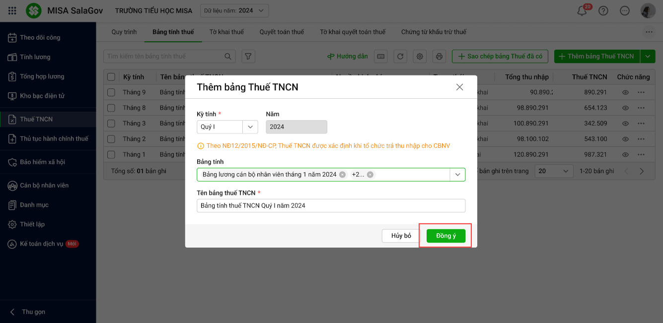 - Chọn bảng tính thuế các tháng/quý đã lập