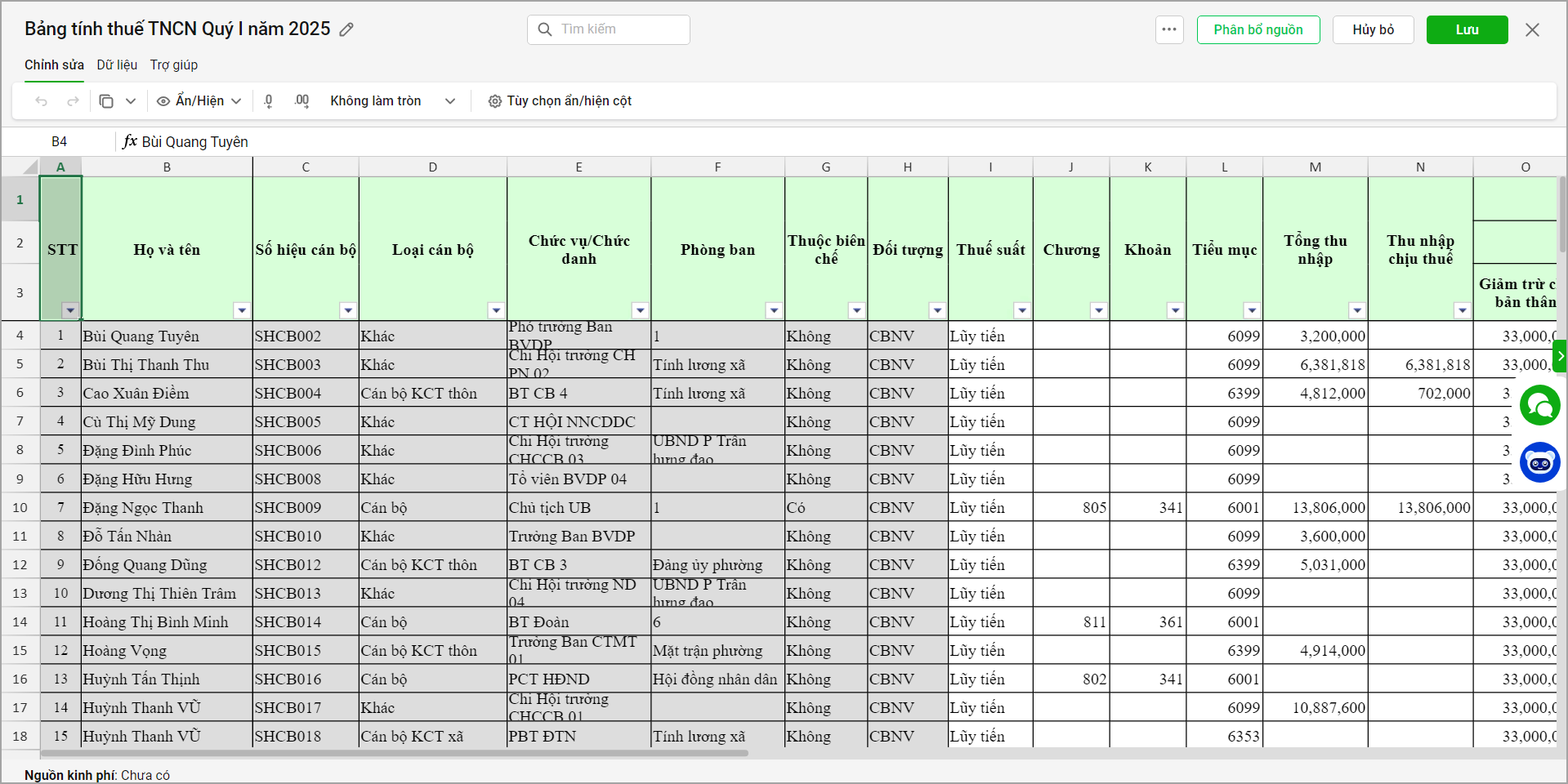 - Bảng tính: Chọn bảng lương hoặc bảng dữ liệu mà kế toán dùng để tính thuế cho CBNV.