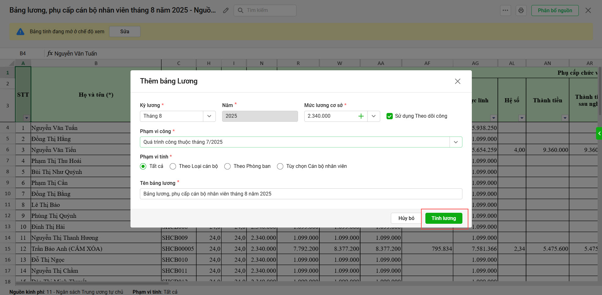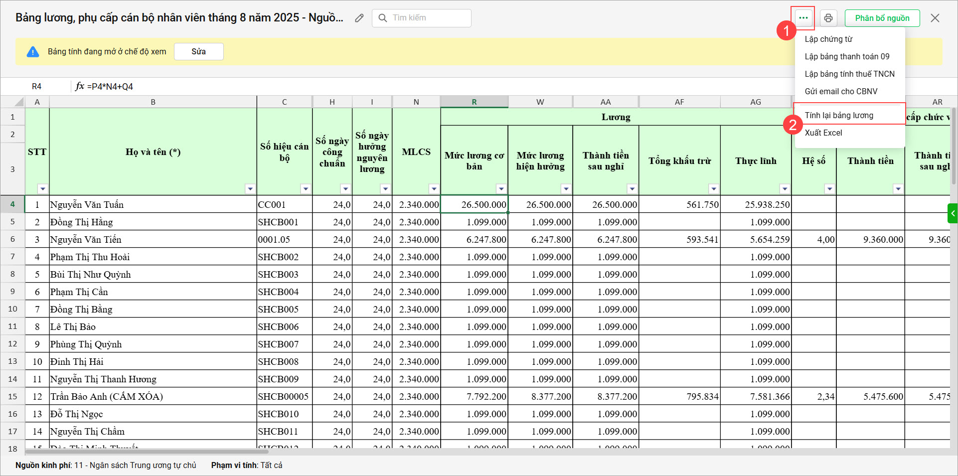 Sau khi đã lập bảng lương, phụ cấp, nếu có thay đổi thông tin và muốn tính lại, tại bảng tính chi tiết, anh/chị chỉ cần chọn tiện ích Tính lại bảng lương. Khi tính lại bảng tính, phần mềm mặc định bảng tính chưa phân bổ nguồn, các bảng tính nguồn con sẽ không được giữ lại.