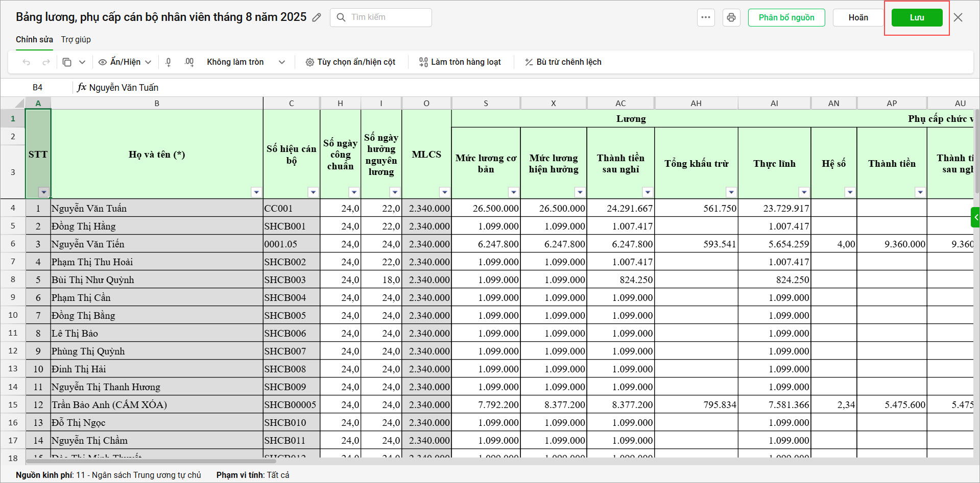 - Phần mềm sẽ tính lương theo các tham số mới này. Anh/chị kiểm tra lại kết quả, nếu đúng thì chọn Lưu.