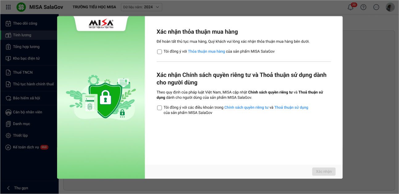 Khi mua mới hoặc gia hạn phần mềm, sau khi đăng nhập hệ thống sẽ hiển thị Thông báo xác nhận thỏa thuận mua hàng.