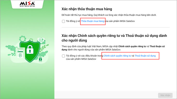 Khi khách hàng mua sản phẩm thì cần xác nhận các thỏa thuận mua hàng theo quy định của MISA.