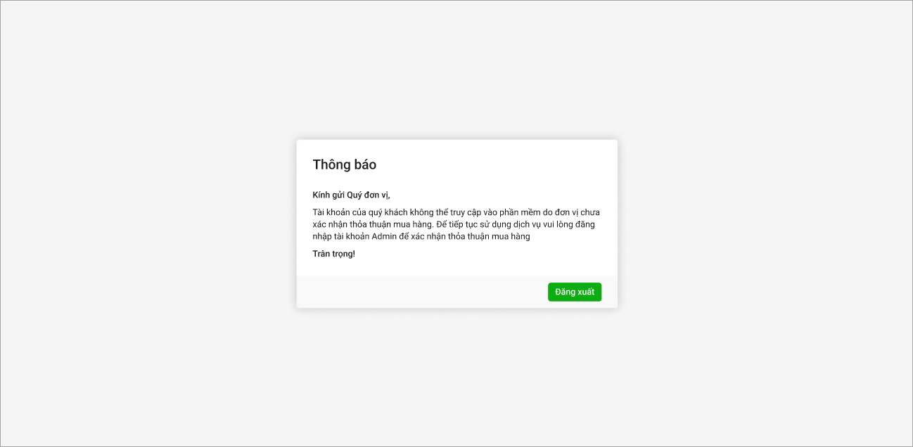 - Nếu admin chưa xác nhận thỏa thuận mua hàng, các tài khoản khác (không phải admin) sẽ khó đăng nhập vào hệ thống, phần mềm sẽ hiển thị thông báo sau