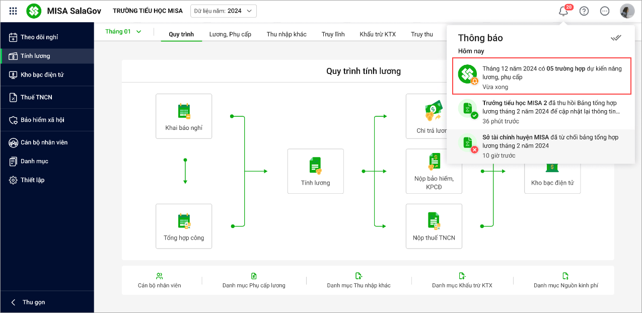 - Phần mềm sẽ hiển thị thông báo: “Có CBNV đến thời gian dự kiến nâng lương, phụ cấp”