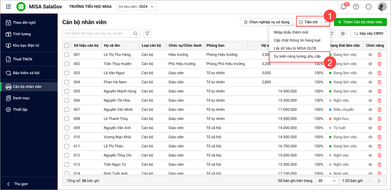 Tại danh sách CBNV: Bổ sung tiện ích Dự kiến nâng lương, phụ cấp