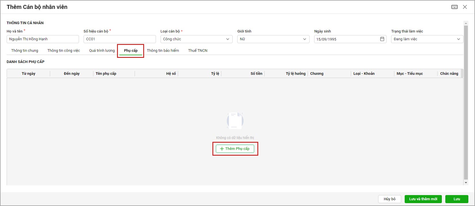 Tại thông tin Phụ cấp để thêm những loại phụ cấp mà CBNV được hưởng, anh/chị chọn Thêm Phụ cấp.