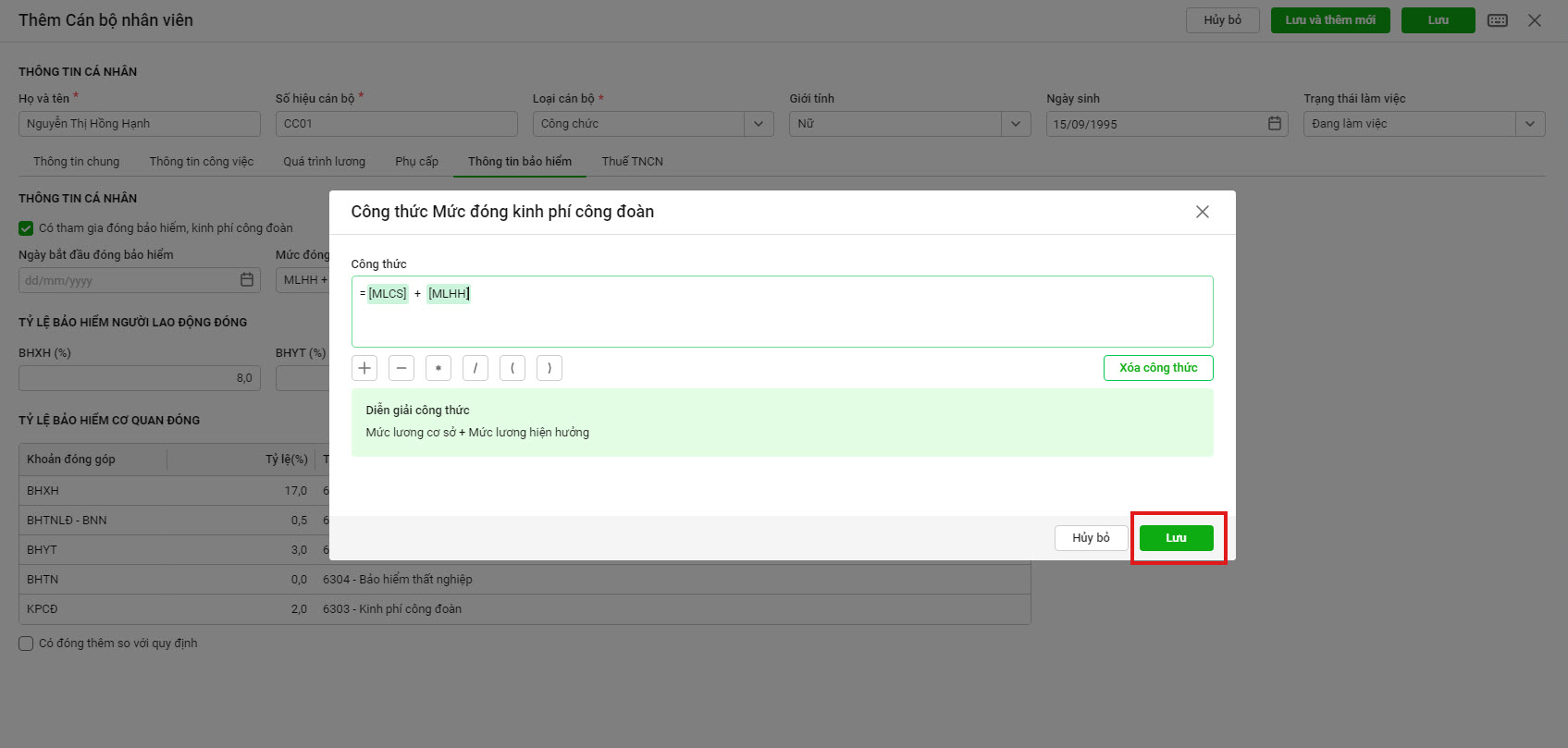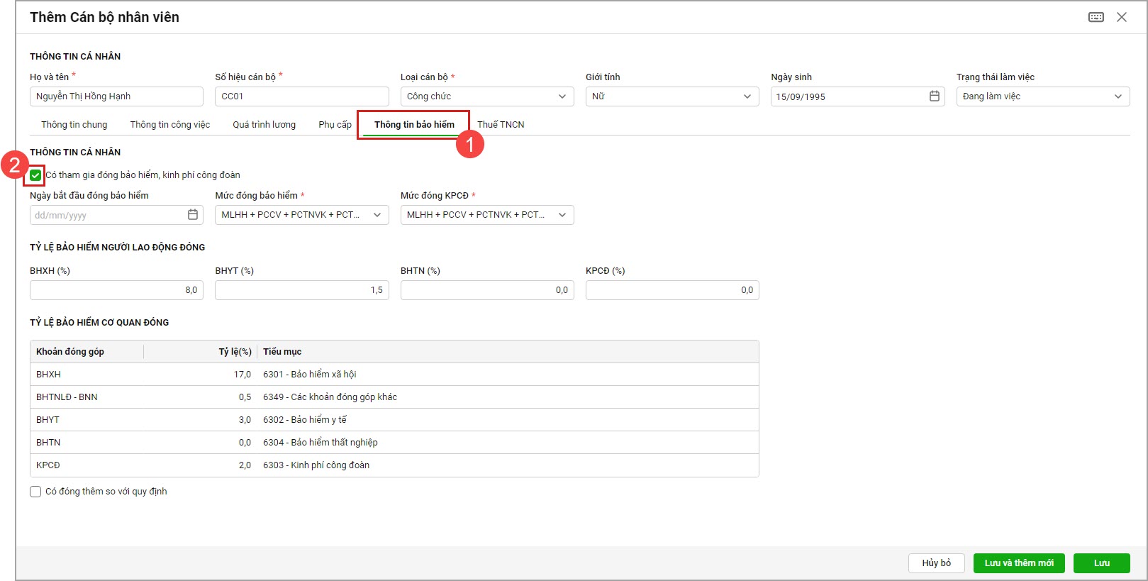 Tại phần Thông tin bảo hiểm để thêm những khoản bảo hiểm, kinh phí công đoàn mà CBNV được hưởng, anh/chị chọn Thông tin bảo hiểm
