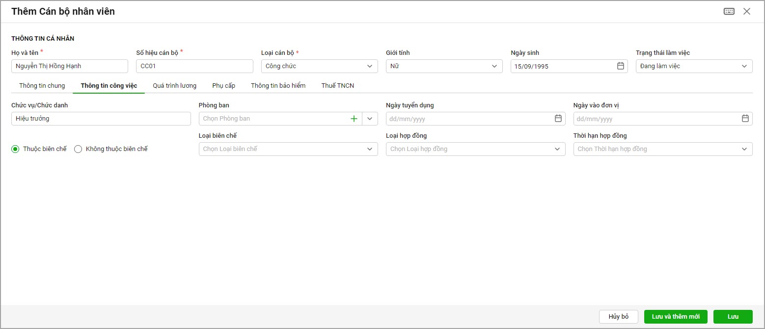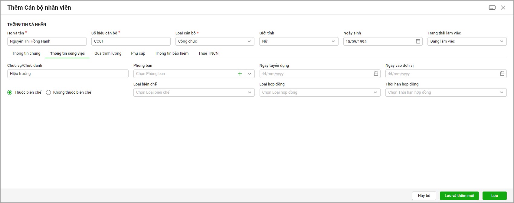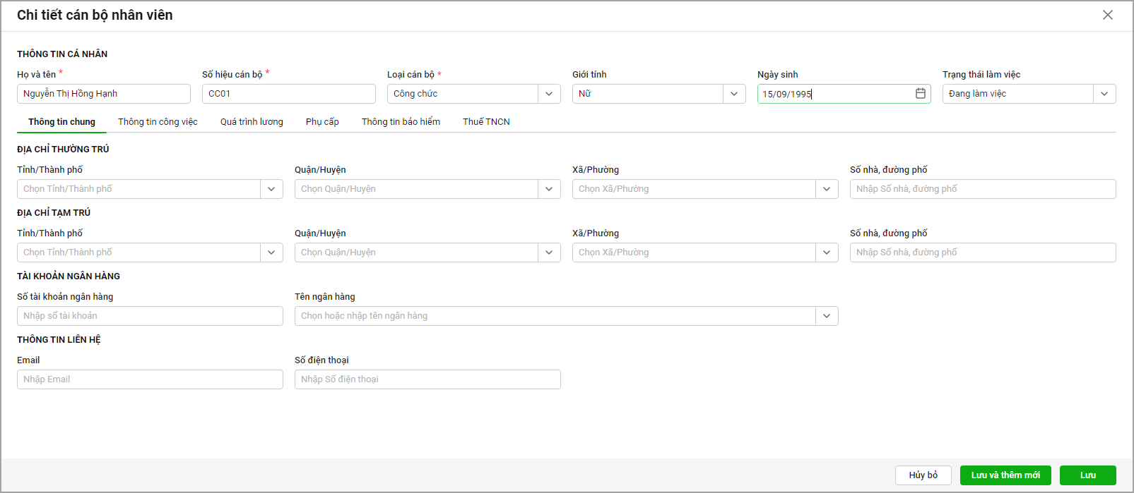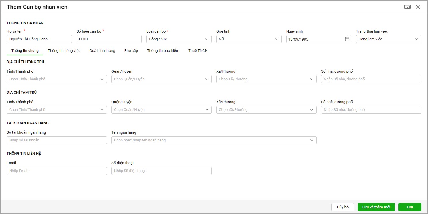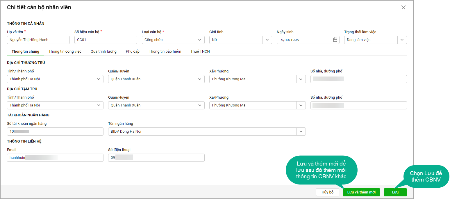 Sau khi khai báo xong các thông tin trên anh/chị chọn Lưu để lưu hồ sơ CBNV, chọn Lưu và thêm mới để tiến hành thêm mới CBNV khác sau khi lưu.