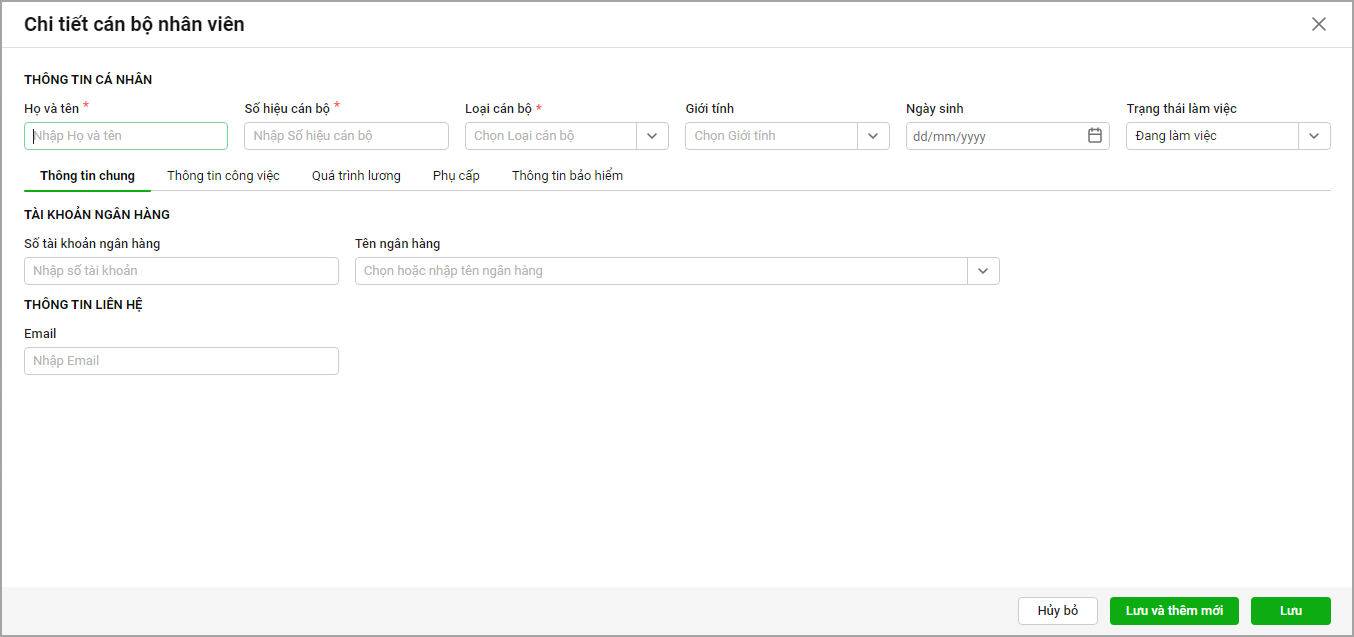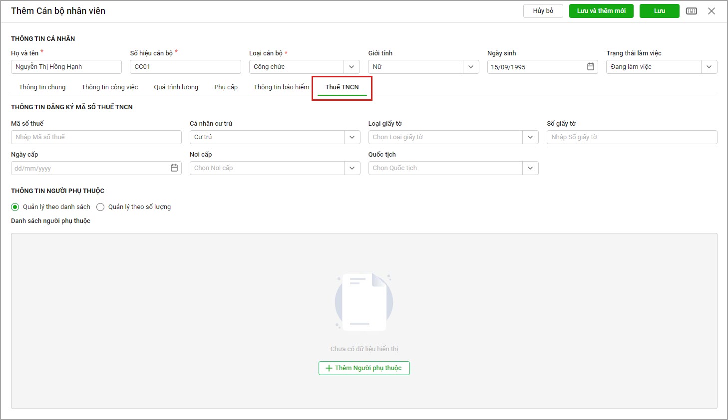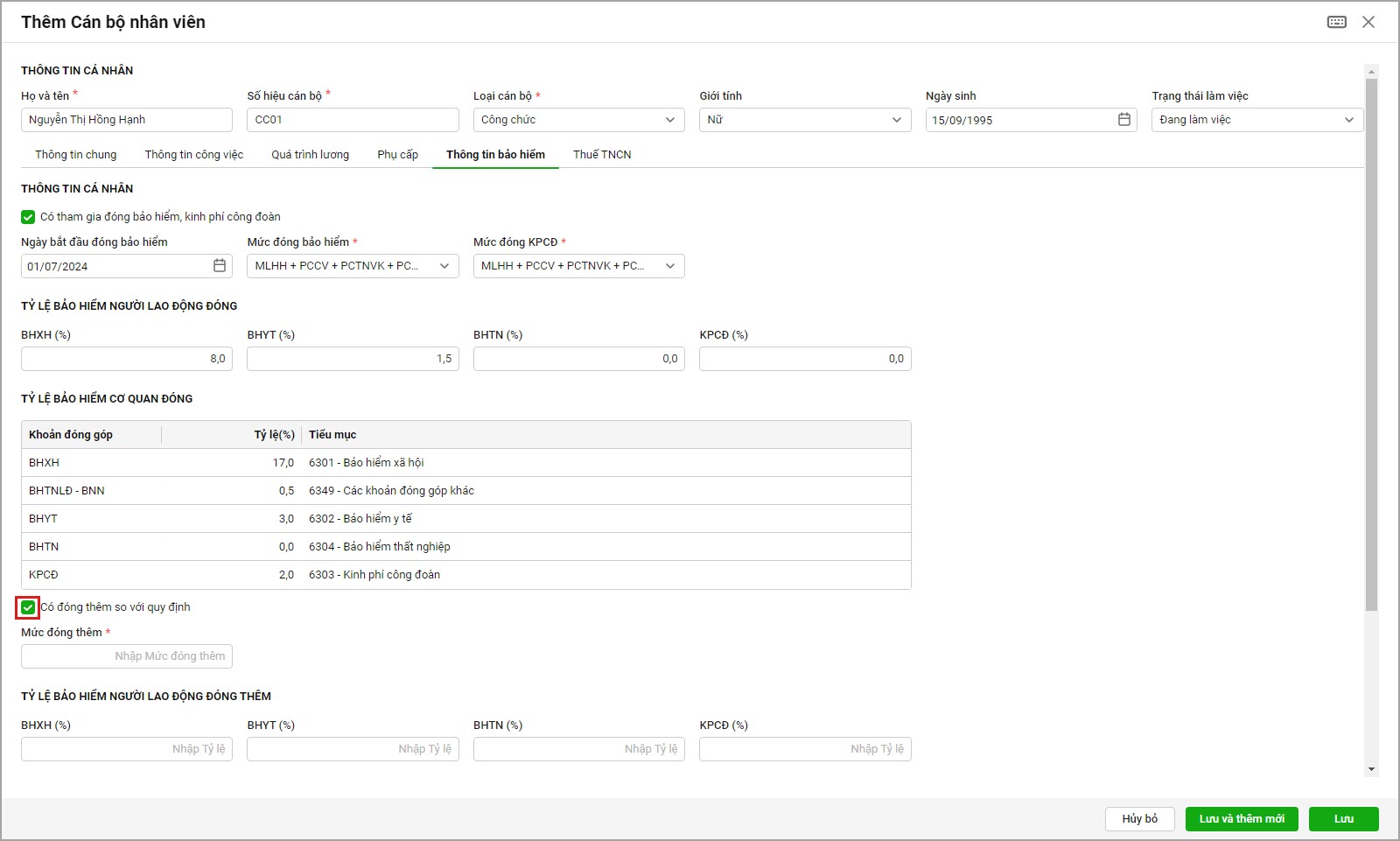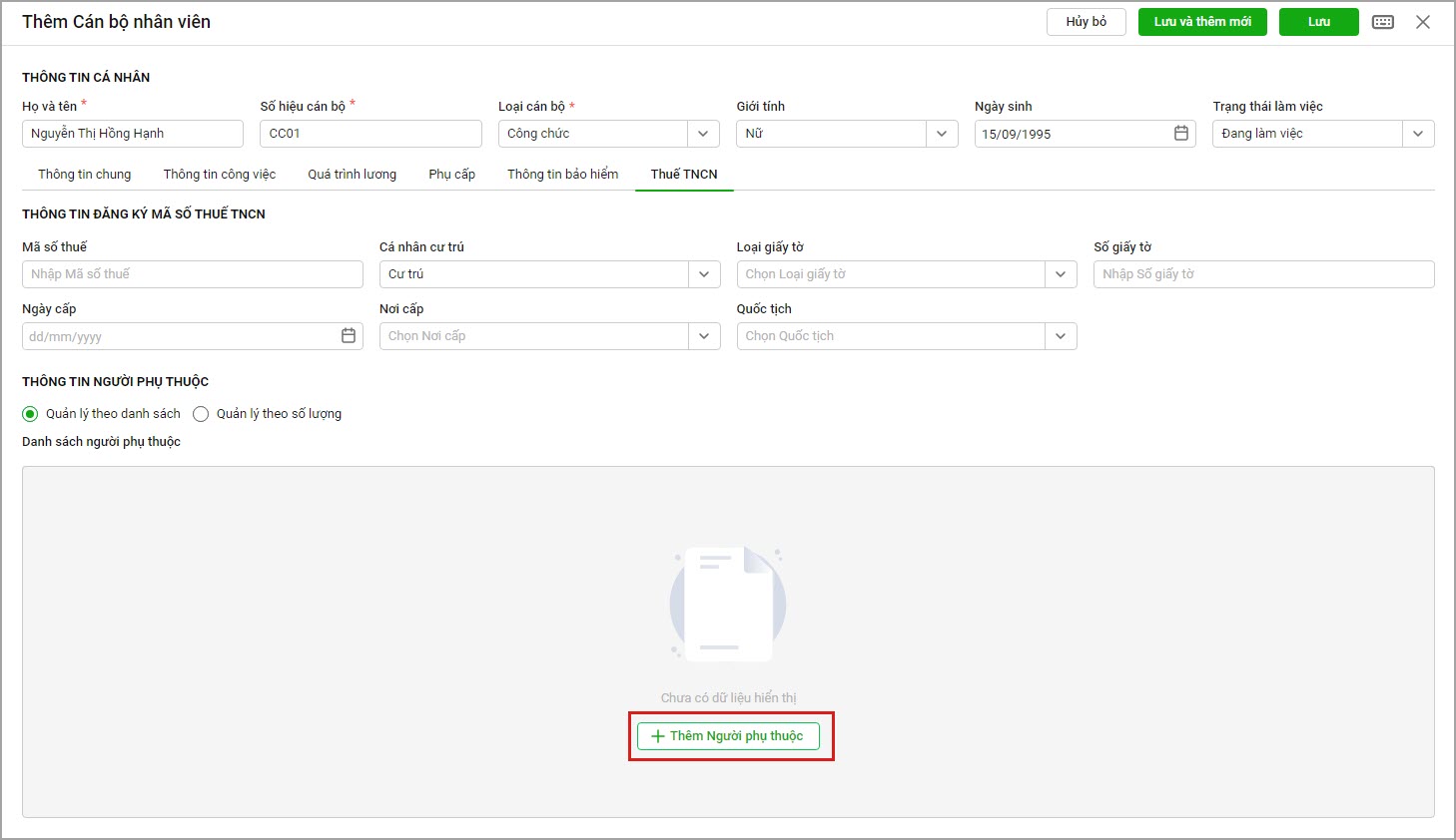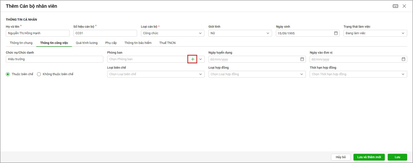 Sau khi khai báo xong các thông tin trên anh/chị chọn Lưu để lưu hồ sơ CBNV, chọn Lưu và thêm mới để tiến hành thêm mới CBNV khác sau khi lưu.