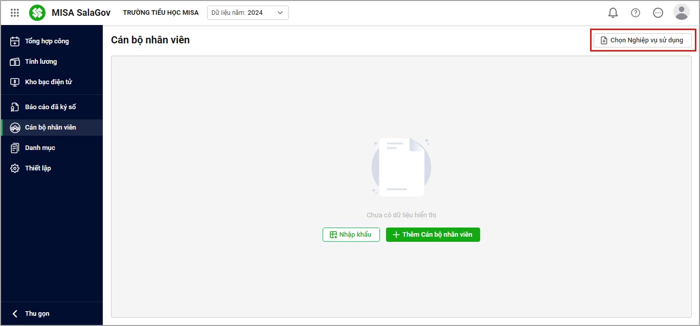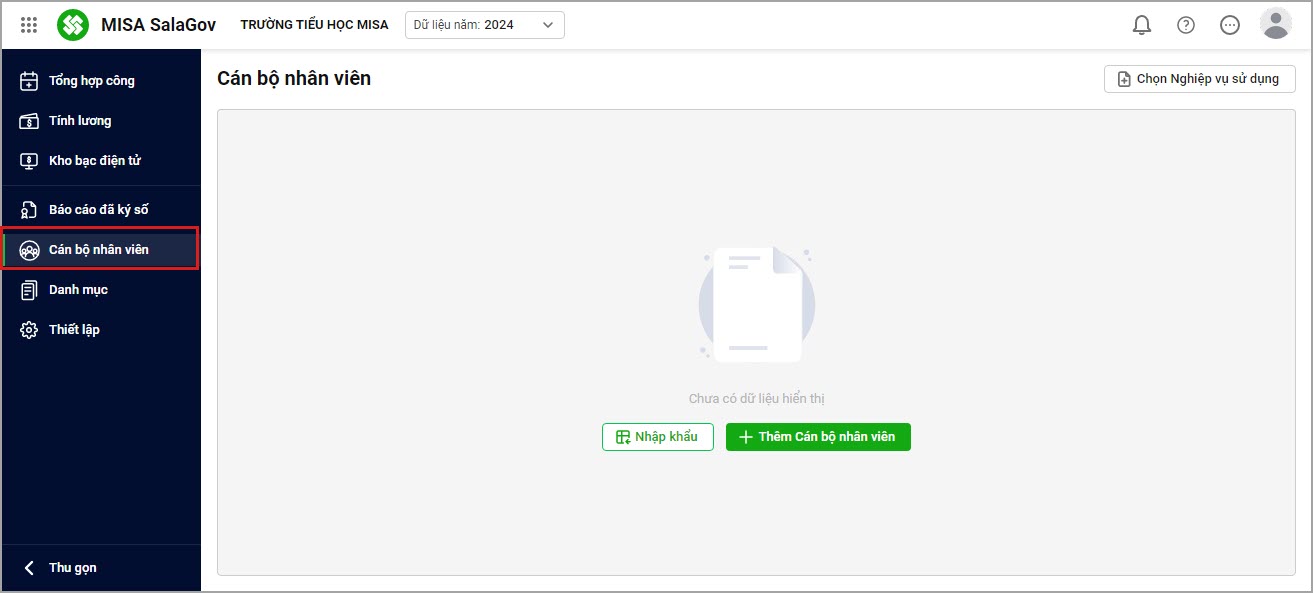 - Chọn menu Cán bộ nhân viên\Nghiệp vụ sử dụng
