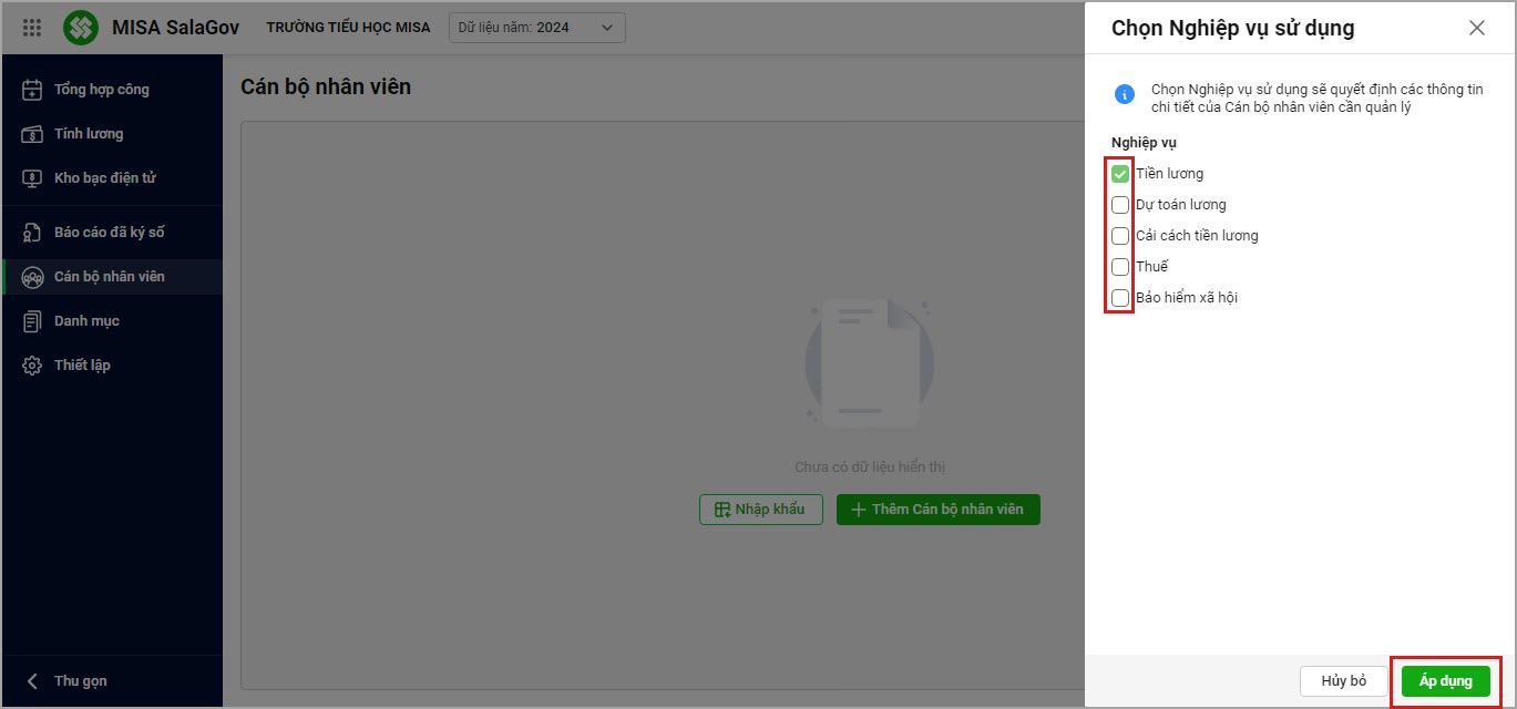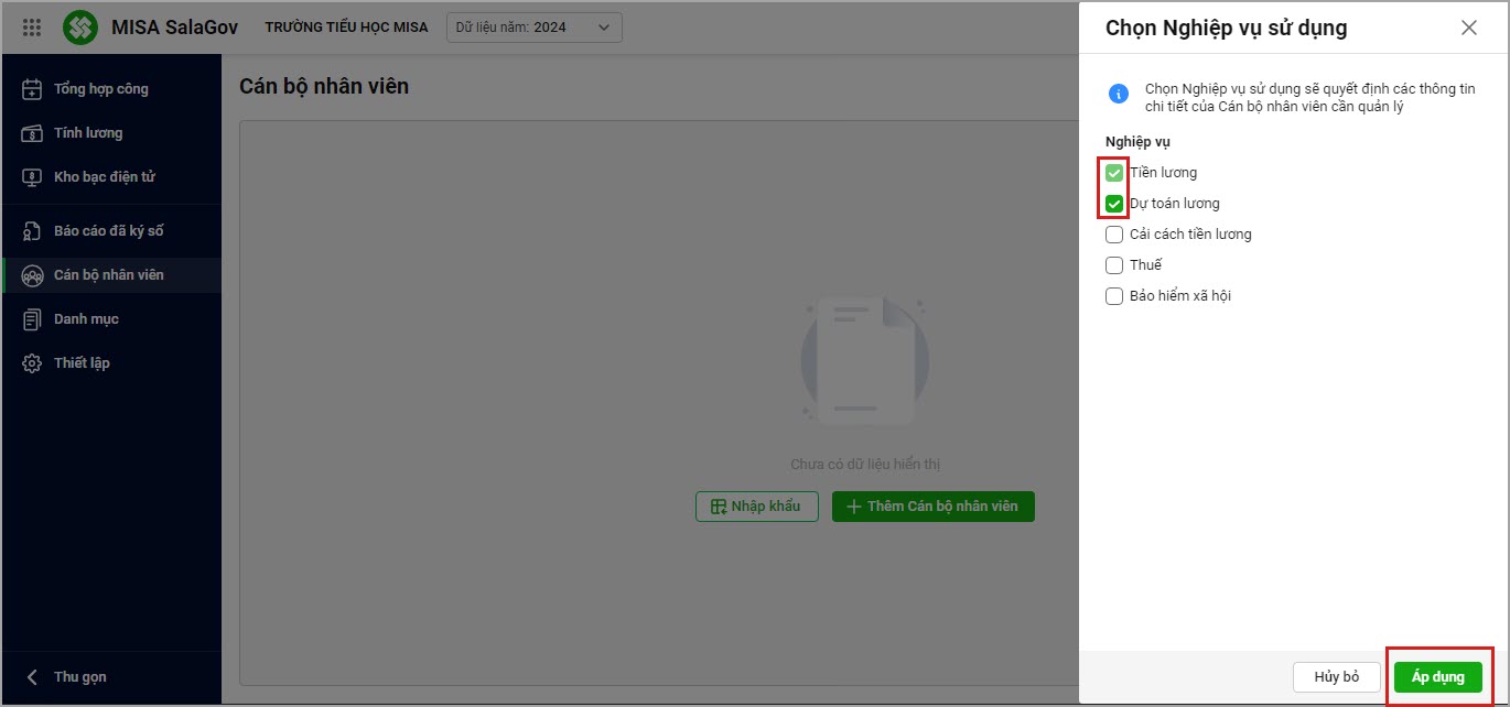 - Tích chọn nghiệp vụ sử dụng tại đơn vị, khi khai báo thông tin CBNV chương trình sẽ hiển thị các trường thông tin cần khai báo tương ứng, nhấn Áp dụng để lưu thiết lập.