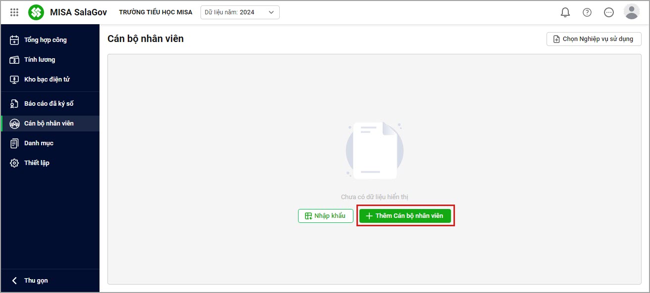 - Để khai báo thông tin hồ sơ của từng CBNV, anh/chị chọn Thêm Cán bộ nhân viên: