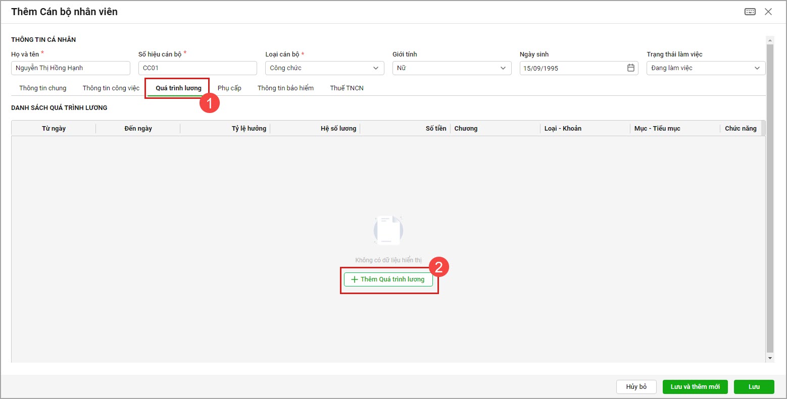 Tại thông tin Quá trình lương khai báo thông tin hưởng lương của CBNV, anh/chị chọn Thêm Quá trình lương.