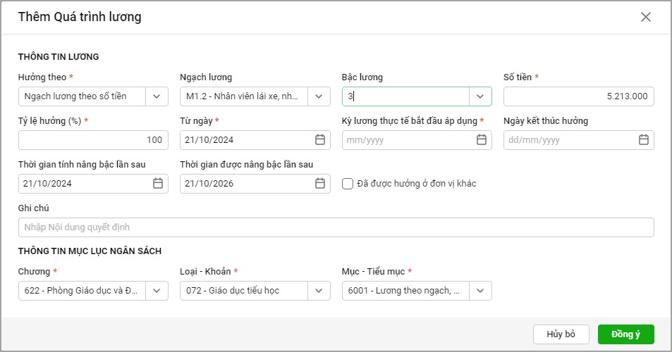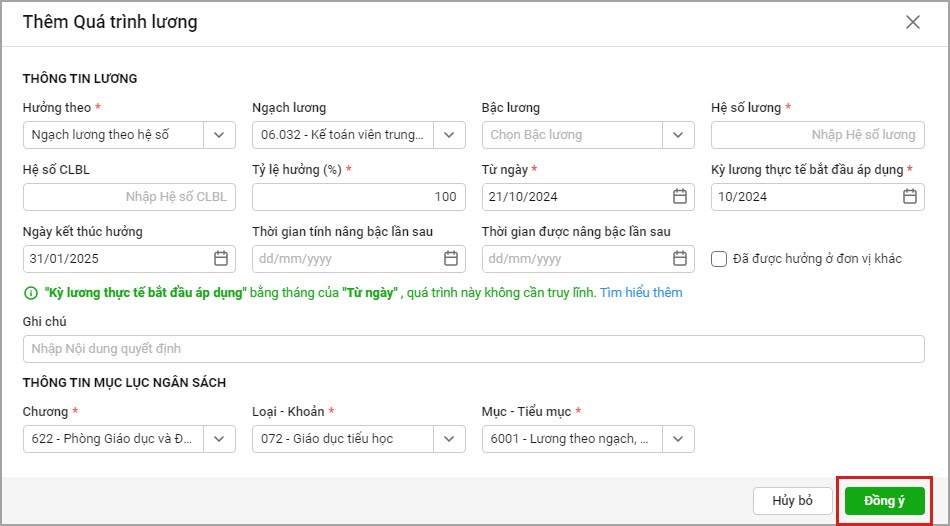 - Nhấn Đồng ý để lưu khai báo thông tin Quá trình lương cho CBNV.
