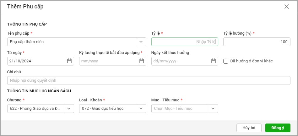 - Chọn Tên phụ cấp. VD: Phụ cấp thâm niên vượt khung