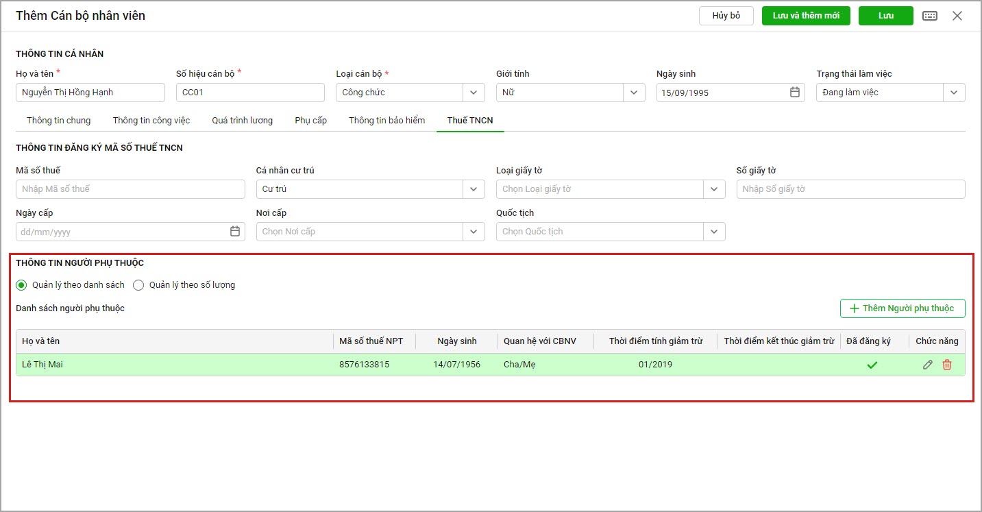 Anh/chị tích chọn Quản lý theo danh sách hoặc theo số lương để quản lý danh sách người phụ thuộc theo danh sách hoặc theo số lượng