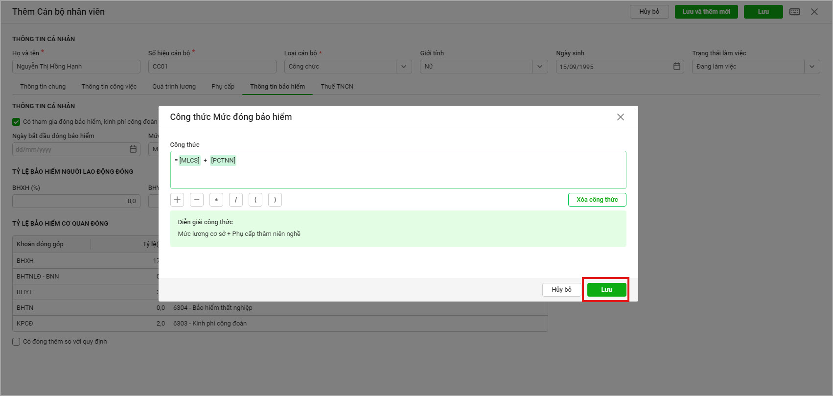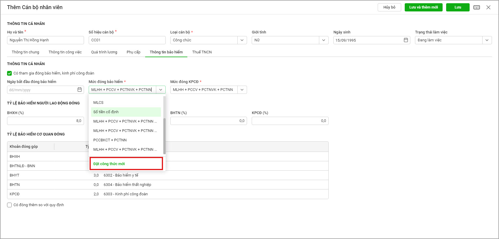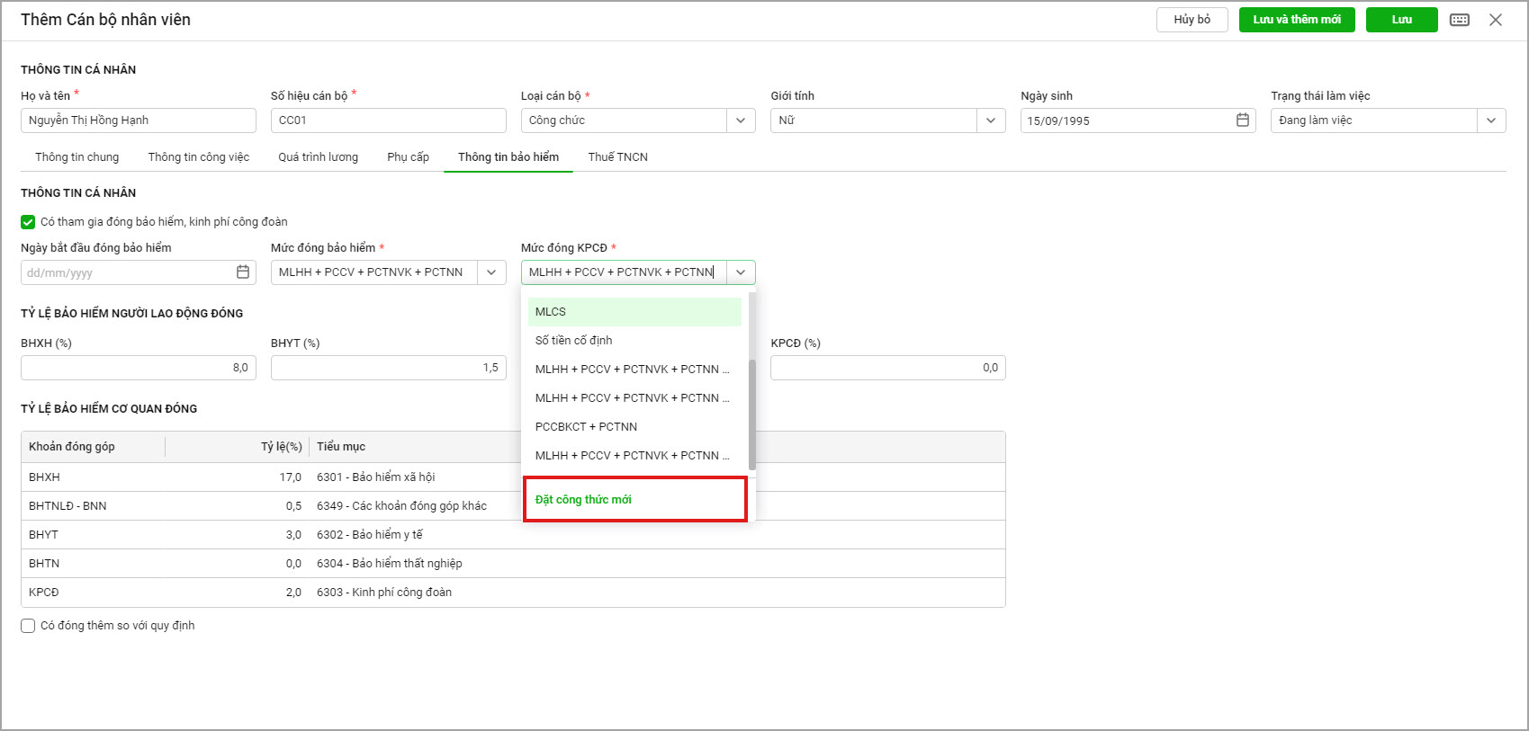 - Mức đóng bảo hiểm đã được phần mềm mặc định hiển thị công thức, nếu đơn vị sử dụng công thức khác anh/chị có thể chọn lại hoặc chọn Đặt công thức mới để thiết lập công thức tại đơn vị