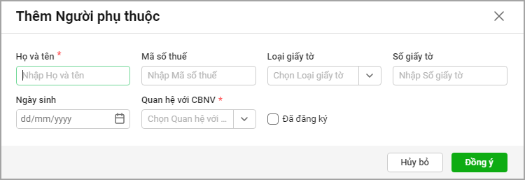 - Khi tích chọn Đã đăng ký phụ thuộc