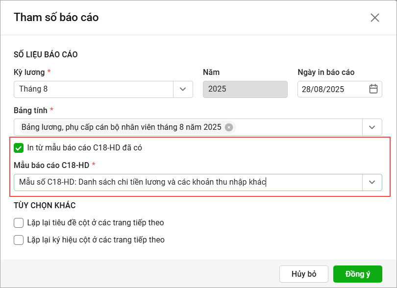 Chức năng bổ sung tại tham số in báo cáo C18-HD