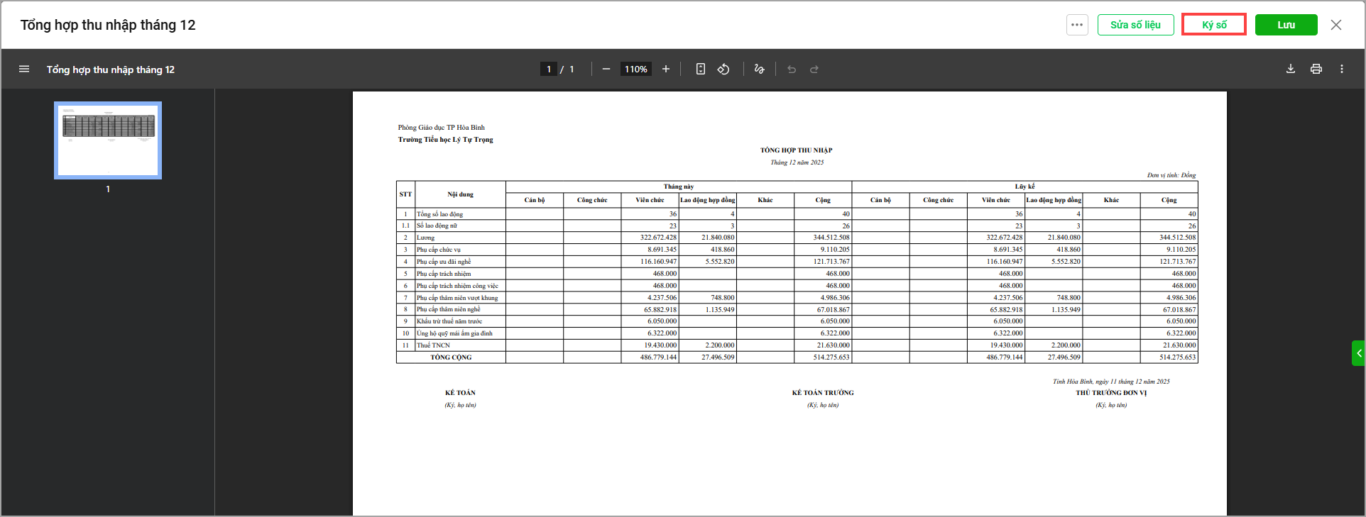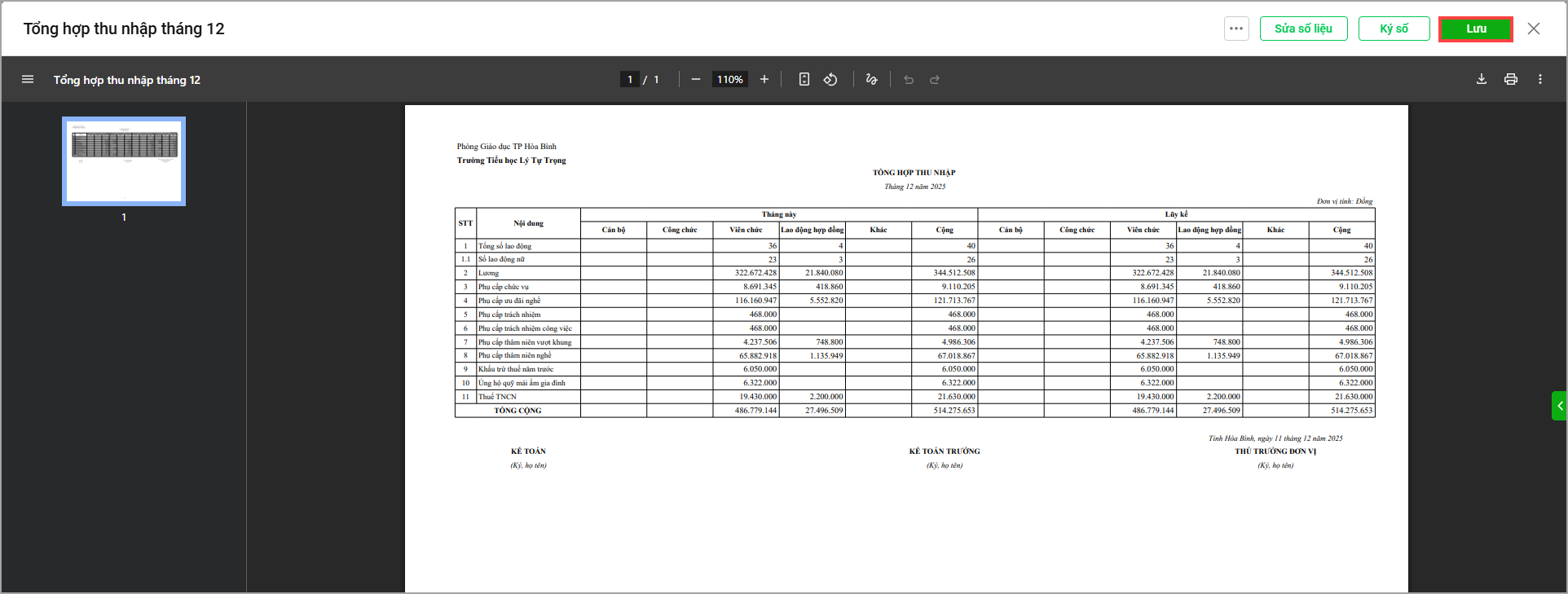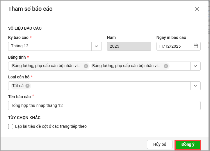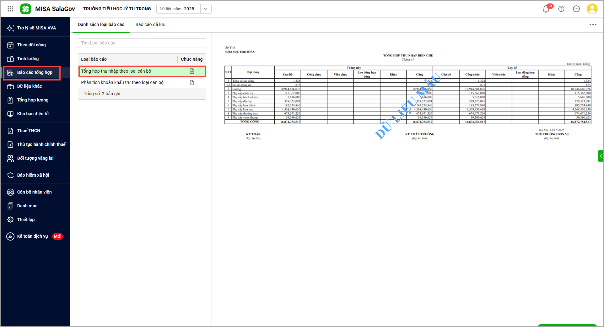 1. Vào Báo cáo tổng hợp/Danh sách báo cáo/Tổng hợp thu nhập theo loại cán bộ
