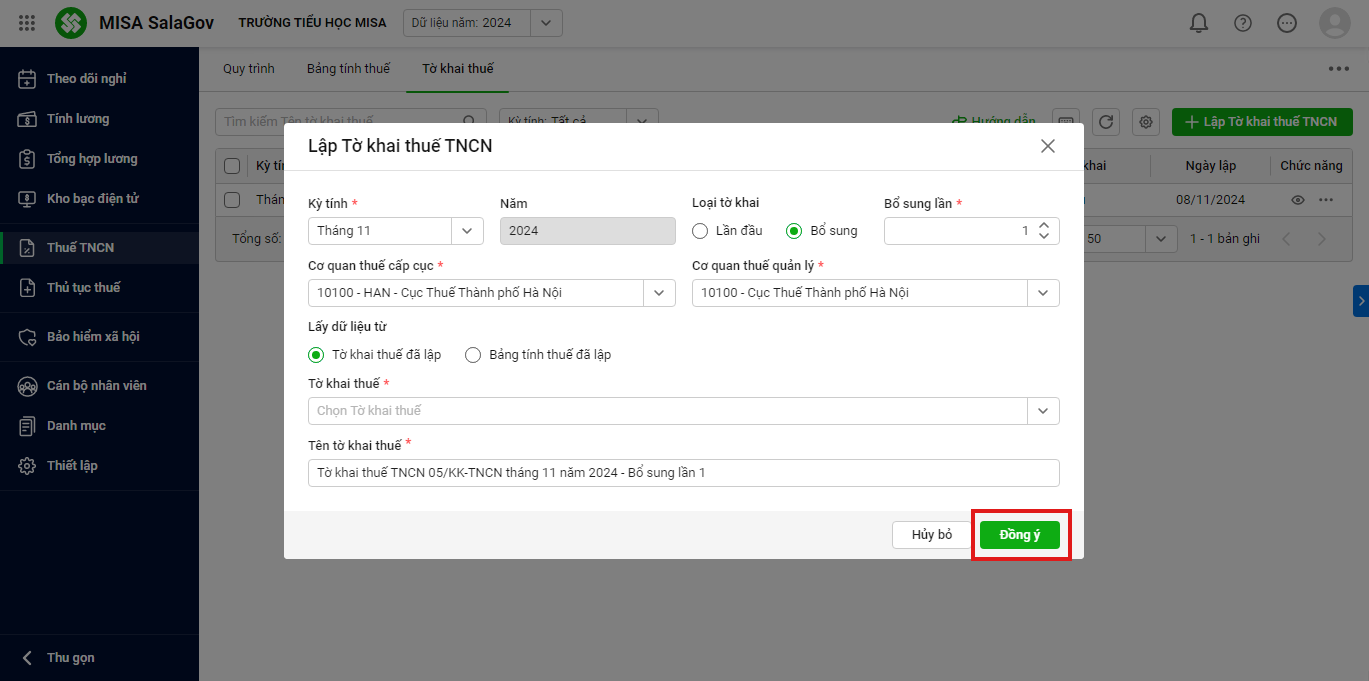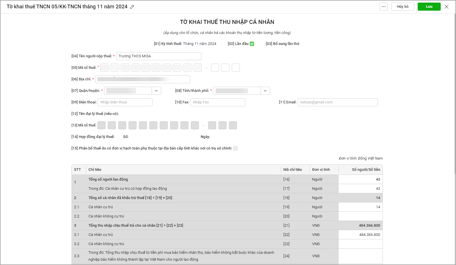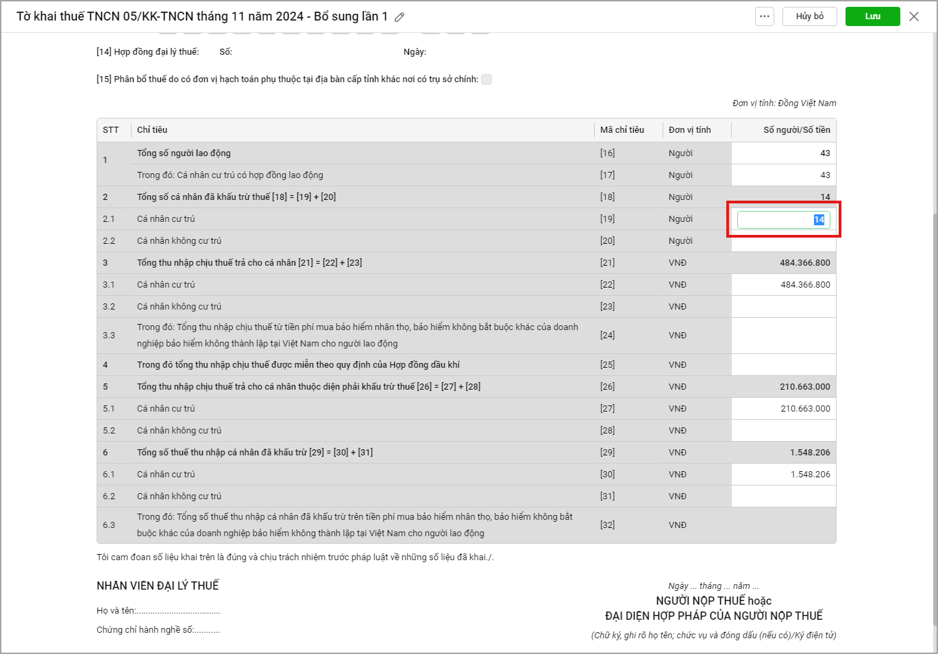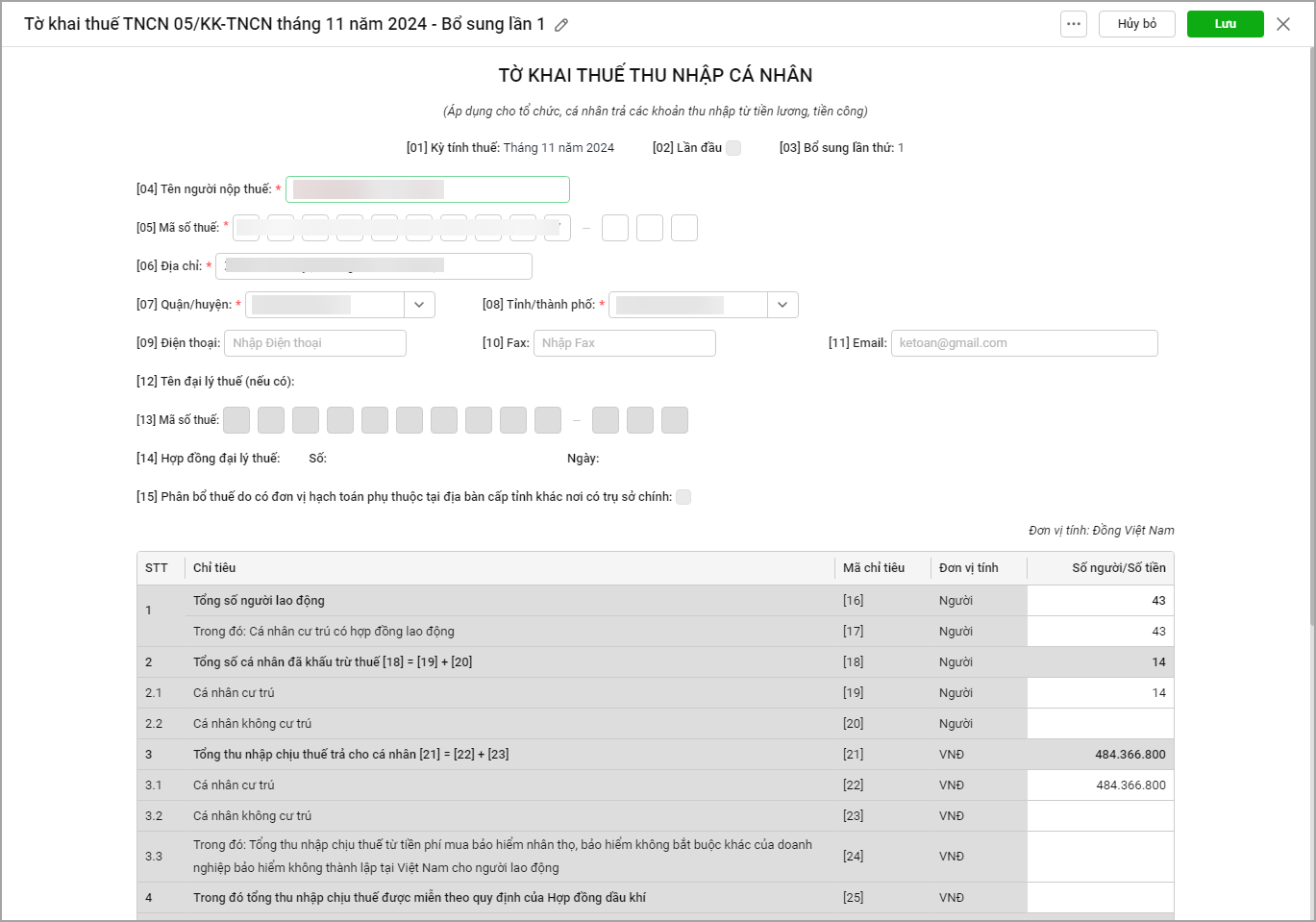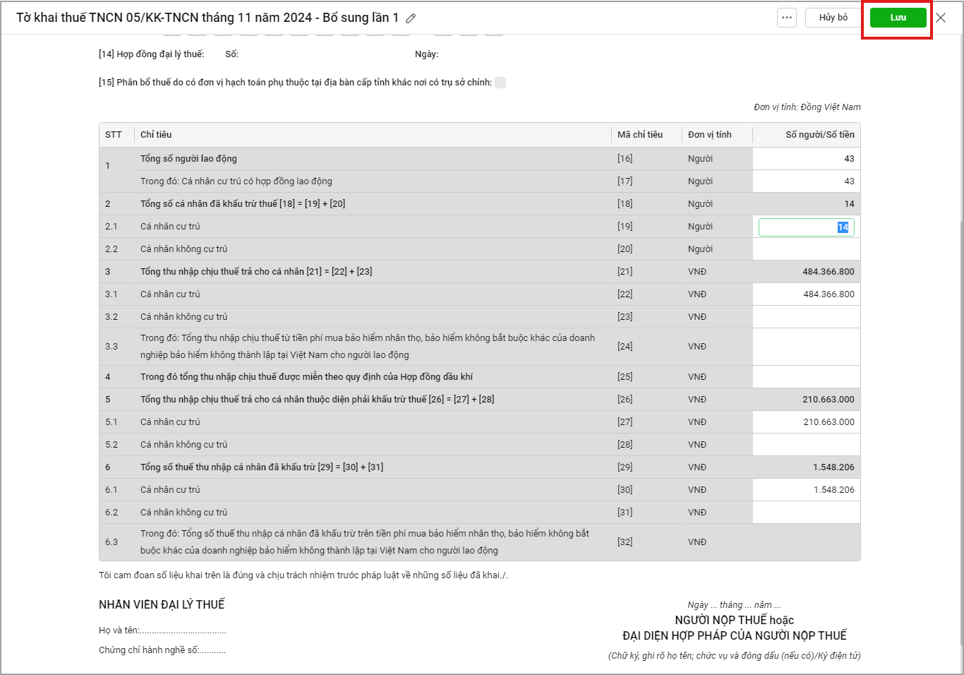 5. Chọn Lưu để lưu tờ khai bổ sung thuế TNCN