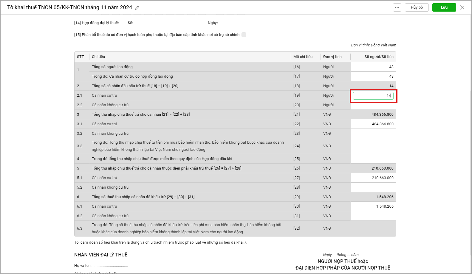 6. Chọn Lưu để lưu tờ khai thuế TNCN