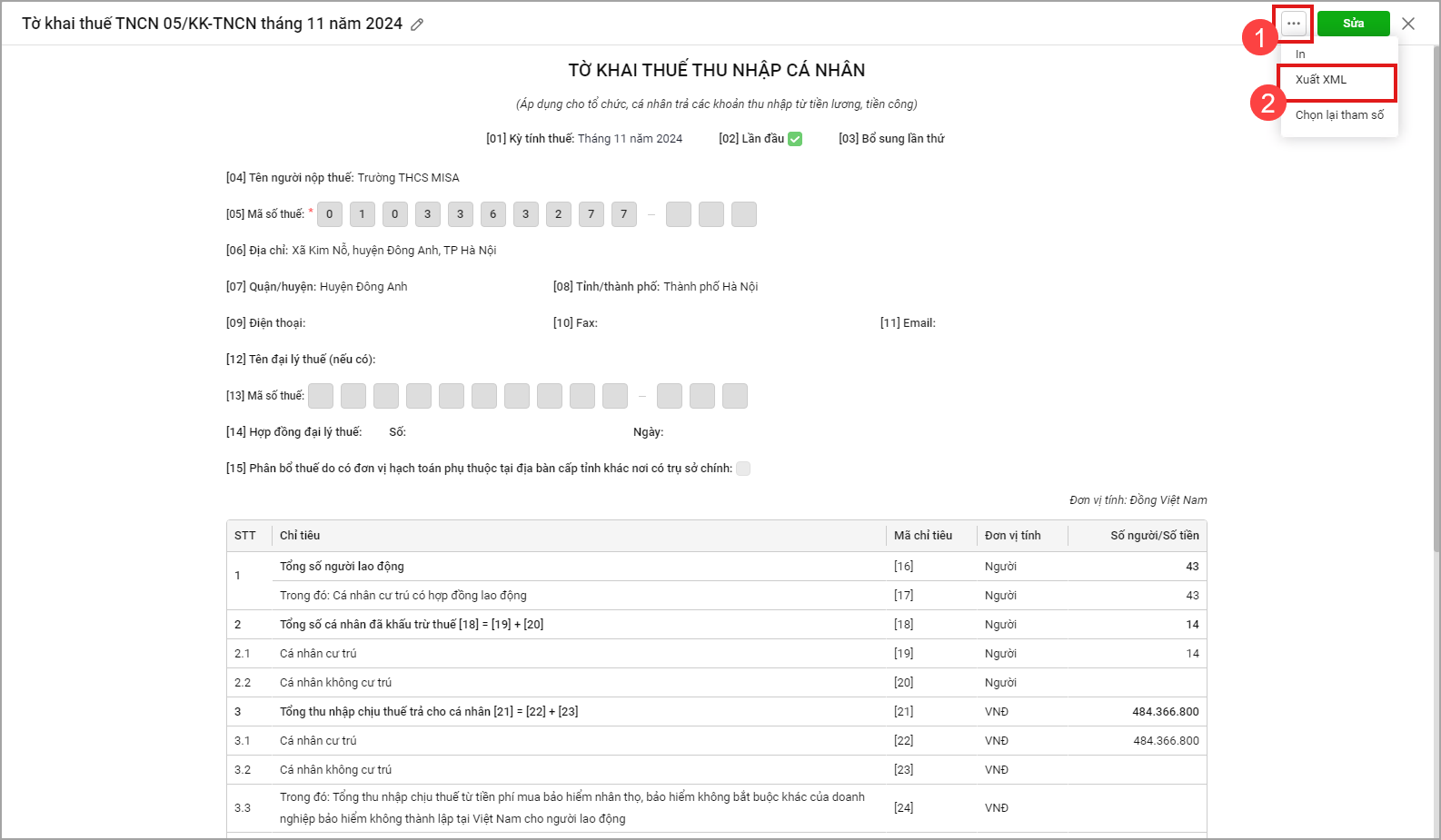7. Để xuất XML tờ khai thuế TNCN để nộp lên cơ quan thuế anh/chị chọn biểu tượng … , chọn Xuất XML
