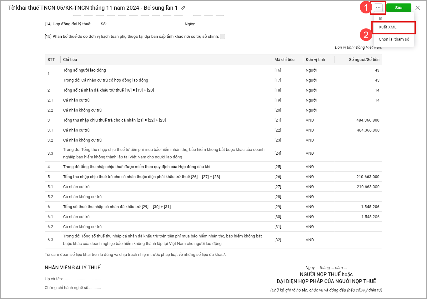 6. Để xuất XML tờ khai bổ sung thuế TNCN để nộp lên cơ quan thuế anh/chị chọn biểu tượng … , chọn Xuất XML