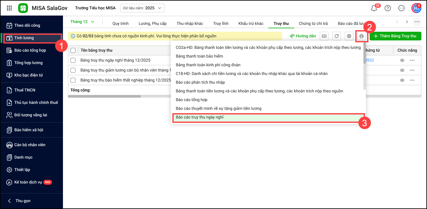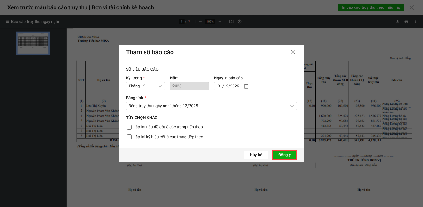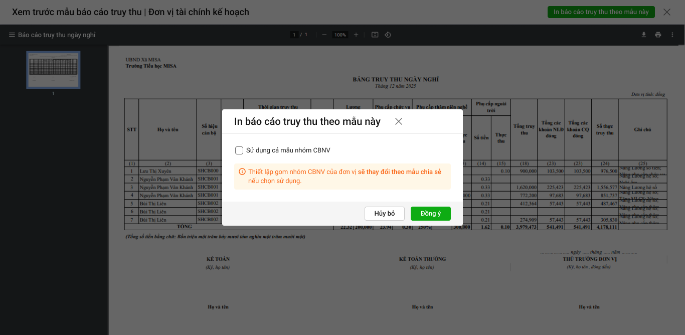 - Nếu đơn vị muốn lập báo cáo truy thu theo mẫu, anh/chị chỉ cần chọn In báo cáo truy thu theo mẫu này