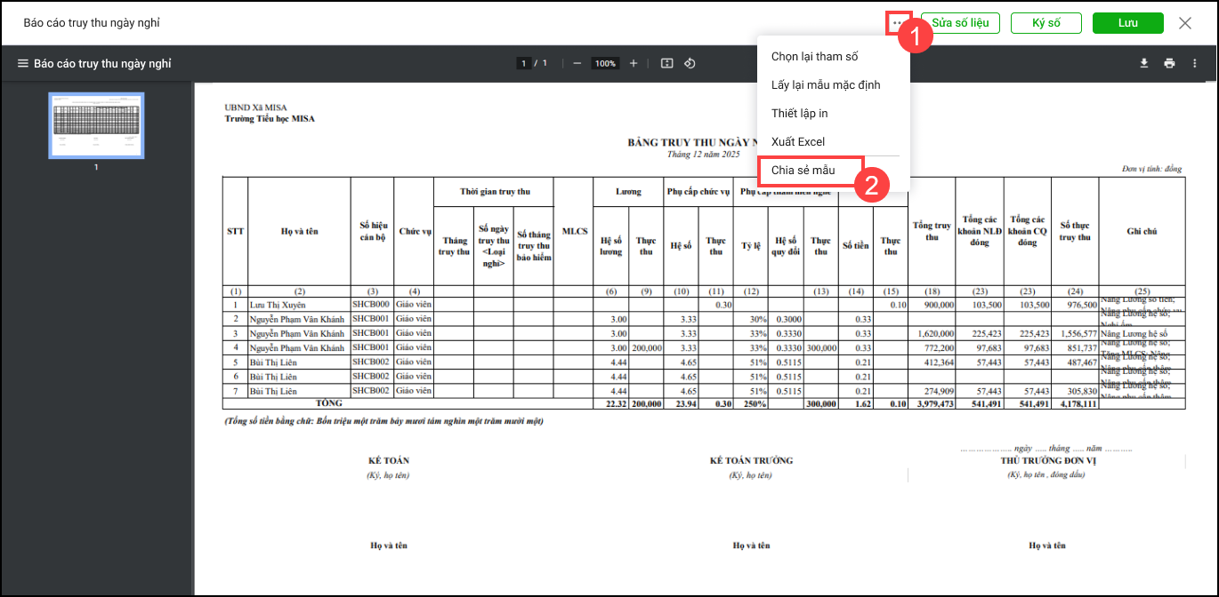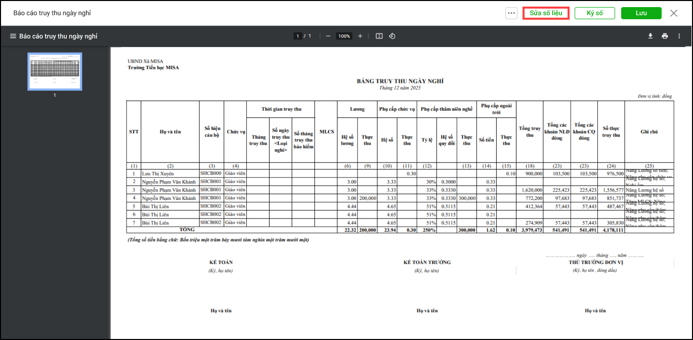 Bài viết hướng dẫn kế toán lập và in báo cáo truy thu ngày nghỉ để nộp lên cơ quan chủ quản. Tổng quan gồm: Lập và sửa báo cáo truy thu ngày nghỉ; In và ký số báo cáo; Chia sẻ mẫu báo cáo