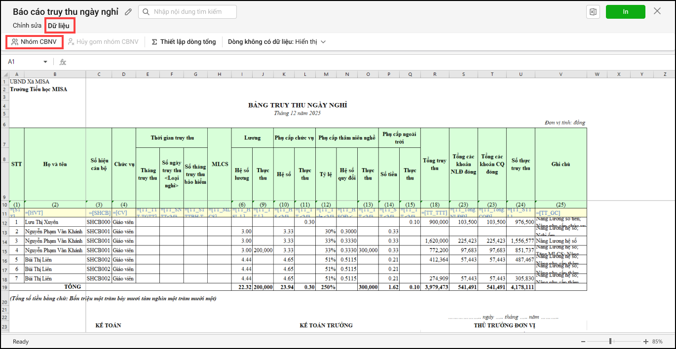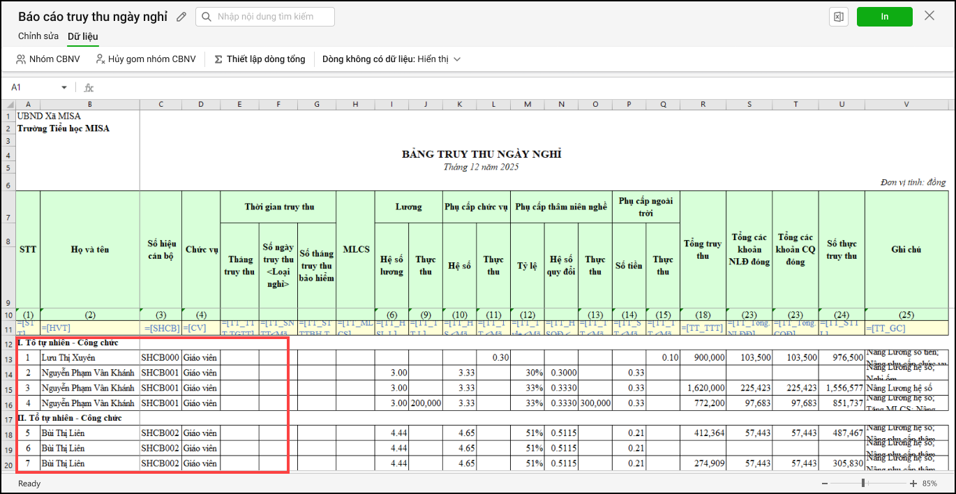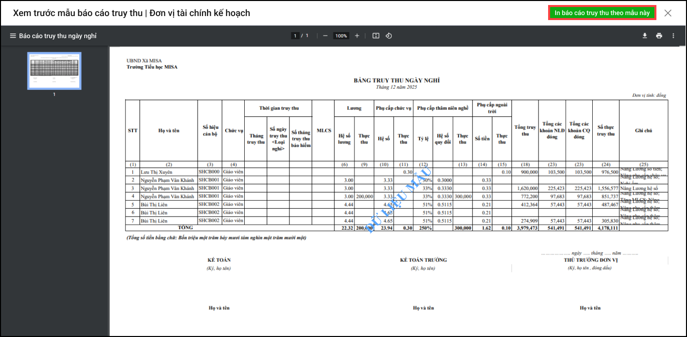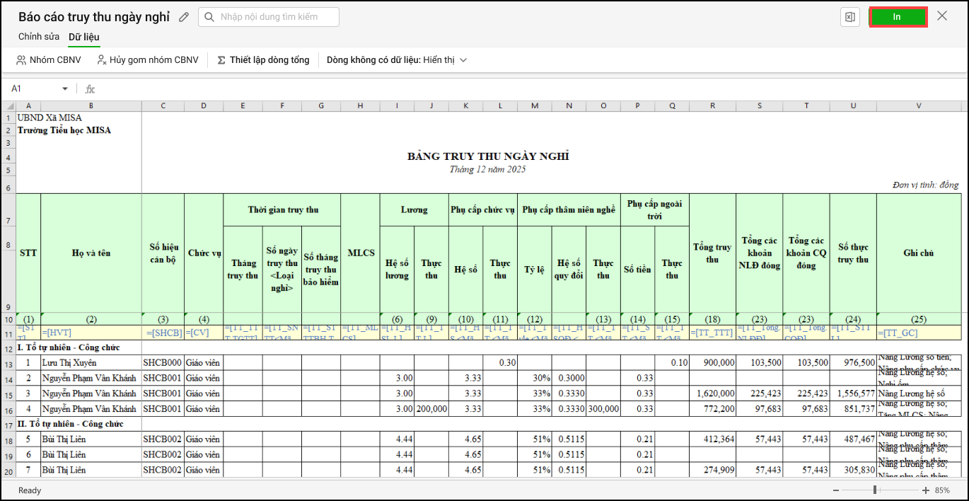 - Kế toán chọn In để tiến hành in báo cáo truy thu ngày nghỉ