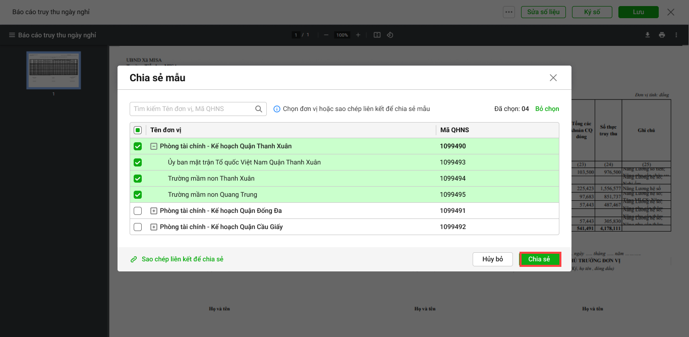 Tích chọn đơn vị muốn chia sẻ báo cáo, chọn đồng ý, phần mềm sẽ tự động gửi báo cáo này đến các đơn vị đã được chọn.
