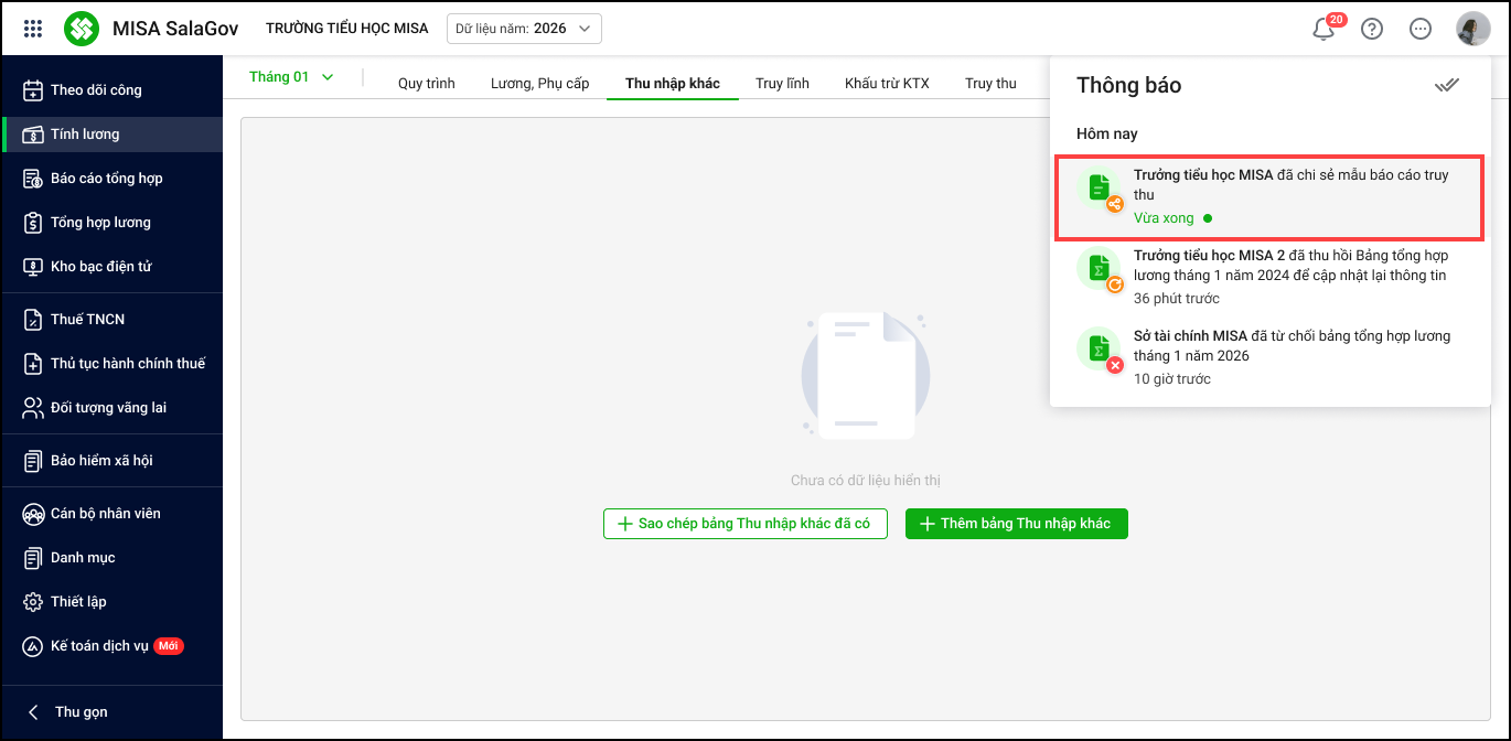 Đối với đơn vị được chia sẻ báo cáo, sau khi đăng nhập vào phần mềm, họ sẽ nhận được thông báo về báo cáo đã được chia sẻ. Khi chọn thông báo này, phần mềm cho phép đơn vị lập mẫu truy thu ngày nghỉ theo mẫu đã được chia sẻ.
