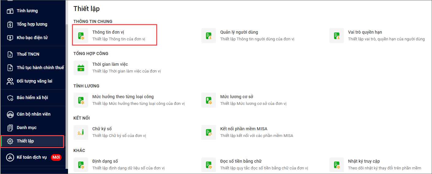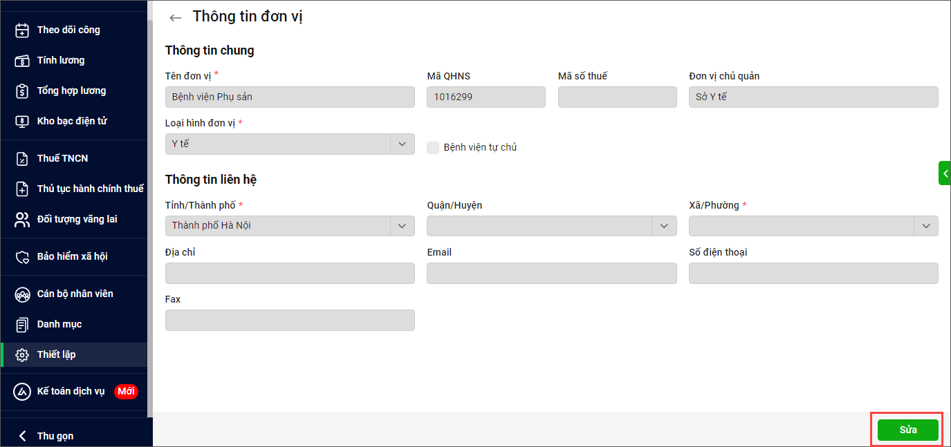 - Vào mục Thiết lập\Thông tin đơn vị.