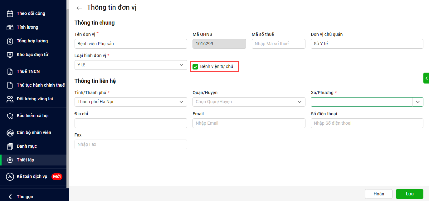 - Tích chọn vào ô Bệnh viện tự chủ.
