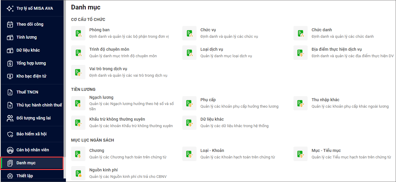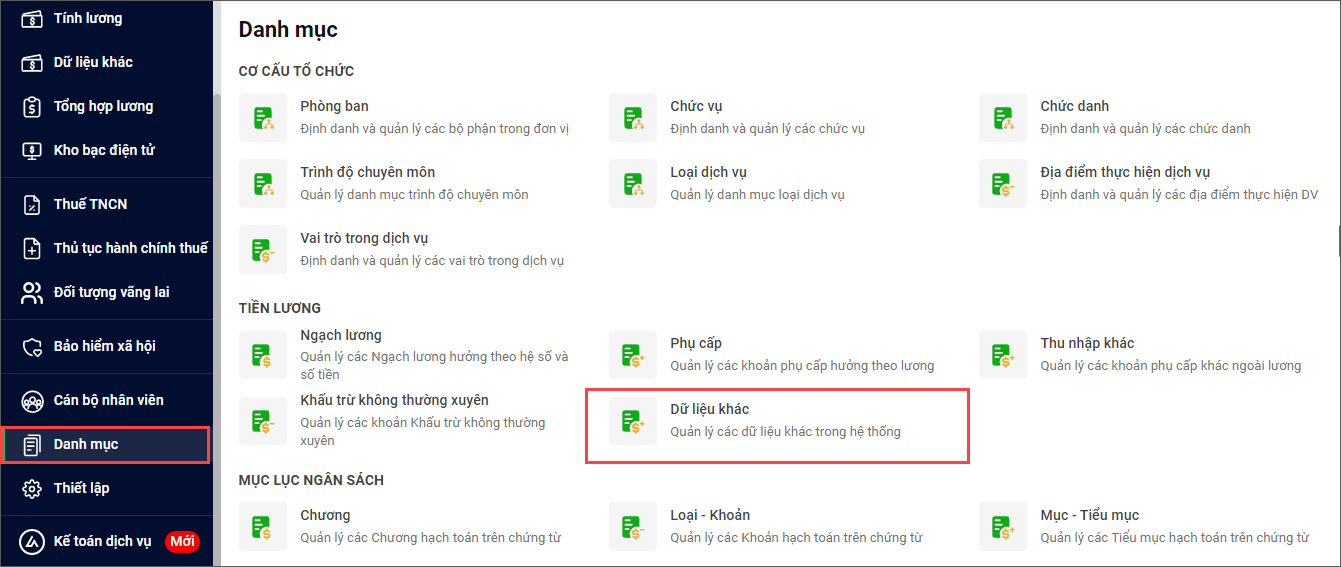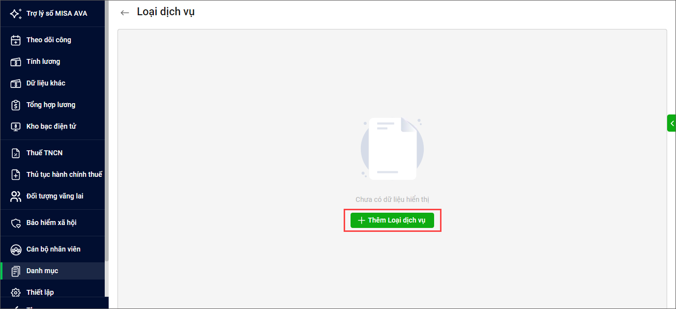 Bước 1: Vào Danh mục, chọn danh mục cần khai báo. Ví dụ: Loại dịch vụ.